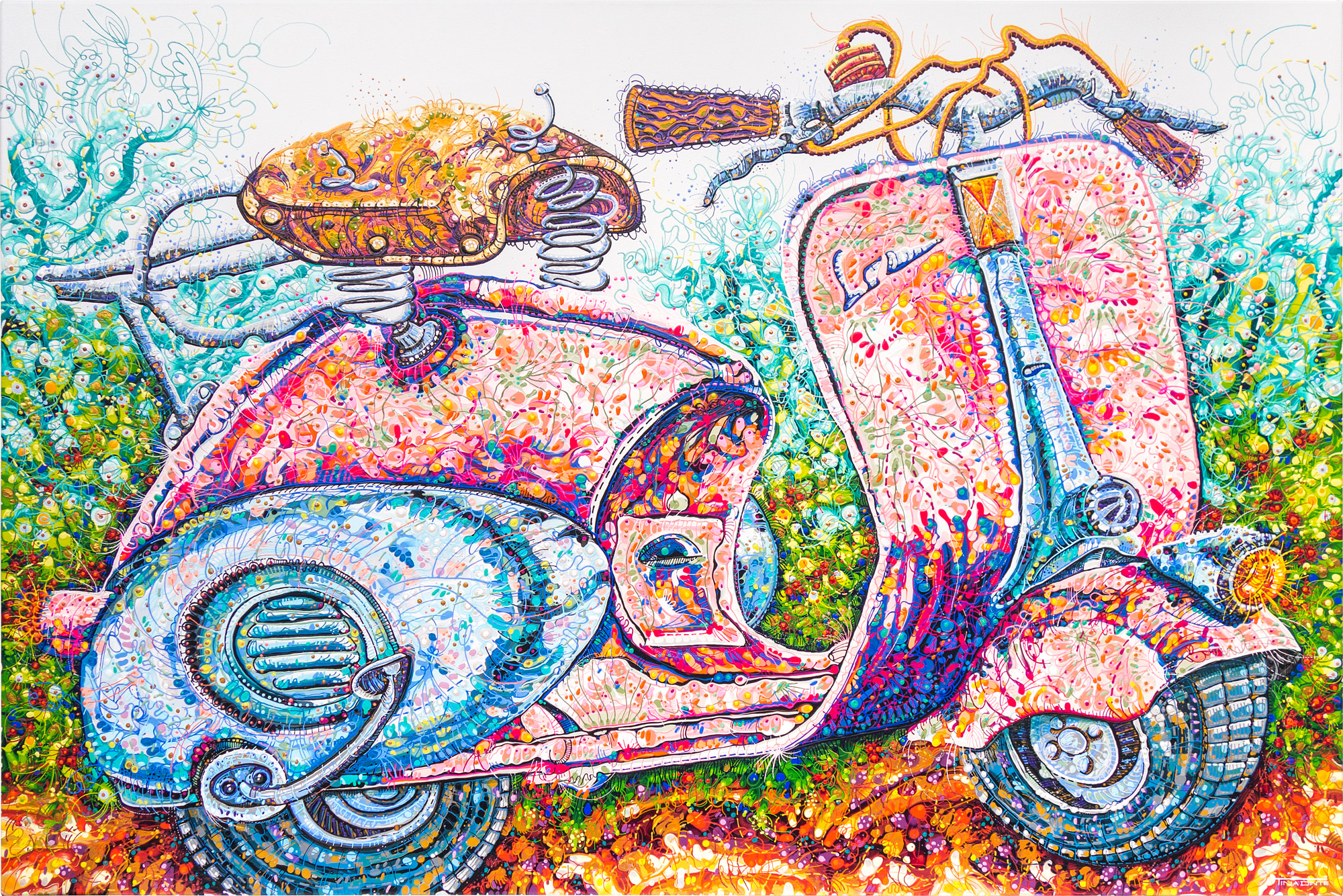 The body of the scooter includes several different pinks, magenta, salmon, soft orange and pale green with electric and prussian blue in the shadows. Other parts of the bikes use a myriad of blues and teals. I went to town with metallic colours on the saddle to simulate shiny vinyl. The Vespa is surrounded with bright green foliage and a soft aqua sky... Please take the time to look at the close-up images - this will really show you how much detail and colour is in the abstract.