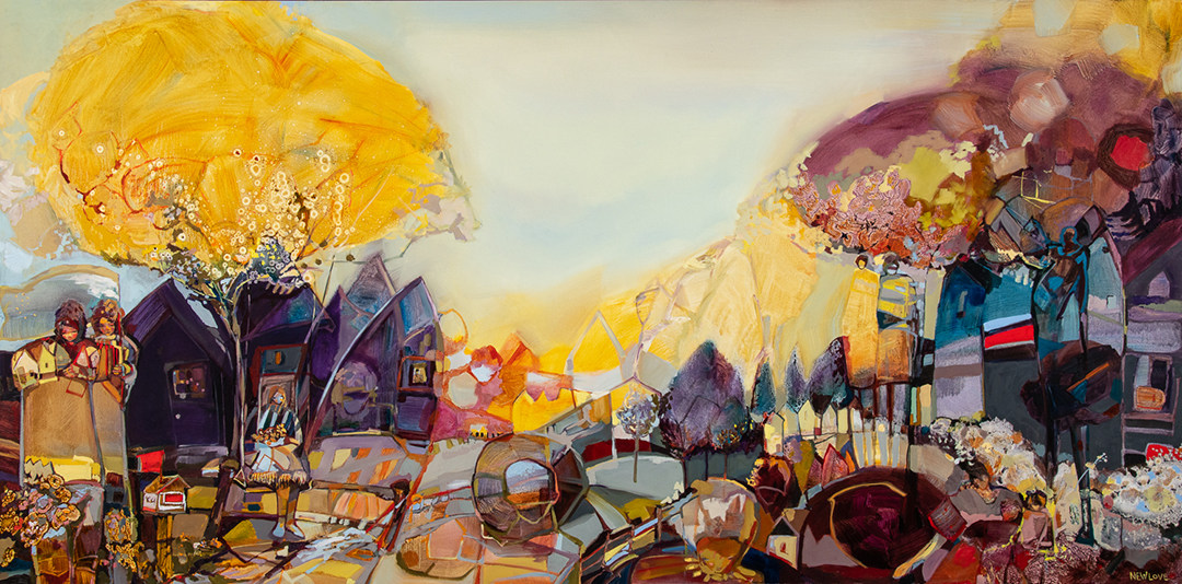 In Conversations pairs of figures walk together enjoying the landscape. On the left a pair hold a flag under a yellow tree on which a figure with a bouquet is seated on a swing. On the very lower central part of the canvas 2 figures of just heads and torsos look down as they walk and to the left further in the background there are a couple pairs of figures among house shapes under soft maroon trees.