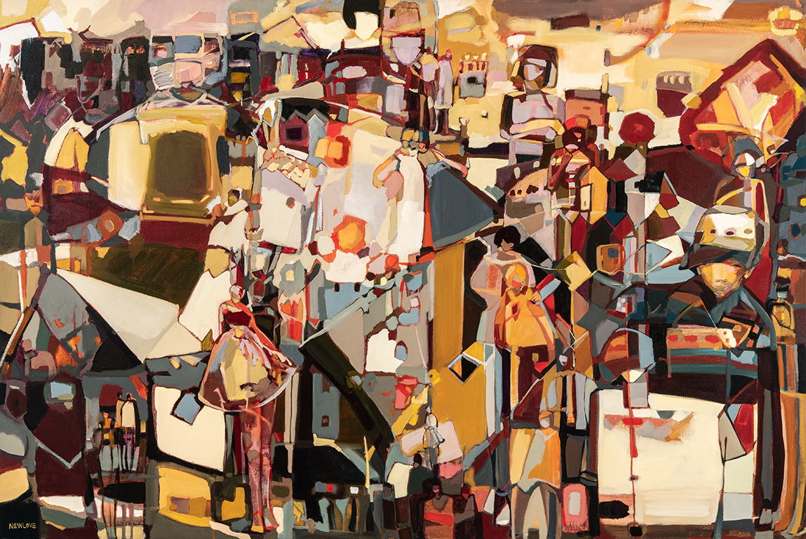 The viewers eye is carried by a zigzag composition through overlapping figures and buildings. The surface of the painting is a mix of colours and shapes that puzzle together to form a complex web of relationships between groups of people.