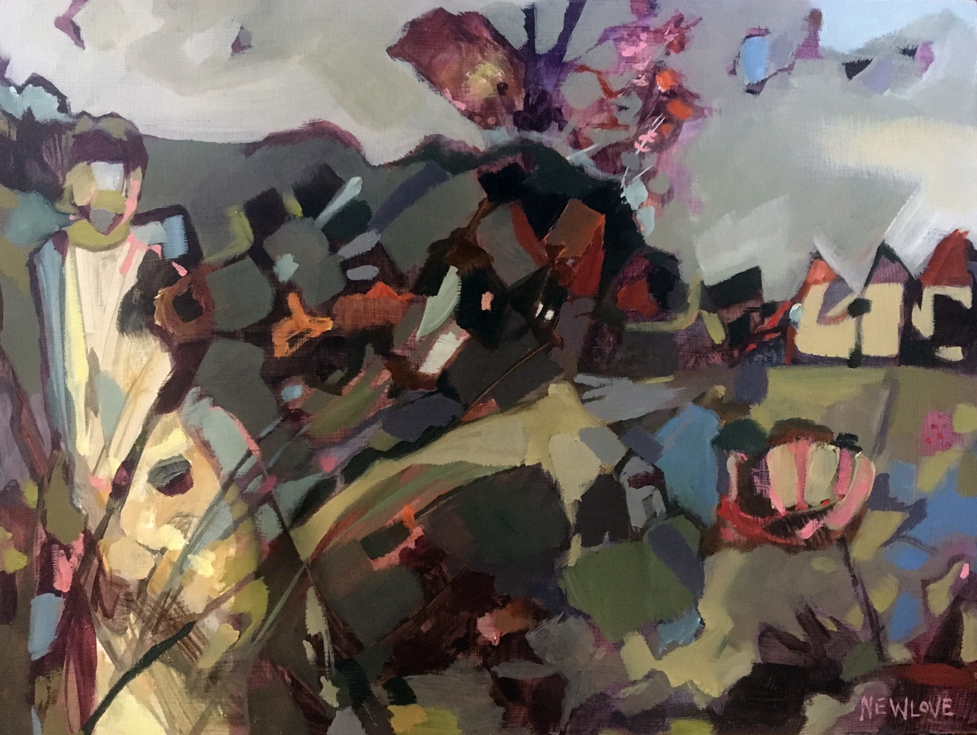 Leaving the City Behind follows a female figure on the left hand side of the wood panel as she walks away from the houses in the background on the right hand side of the panel into a flower-filled country setting.