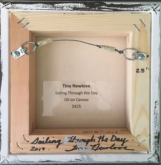 Sailing Through the Day depicts a small neighbourhood with trees in the bottom left-hand corner while a larger then life abstract sailboat floats past. The painting has a dreamy quality and the prominent sailboat reflects my anticipation for the next quiet day with water and sun.