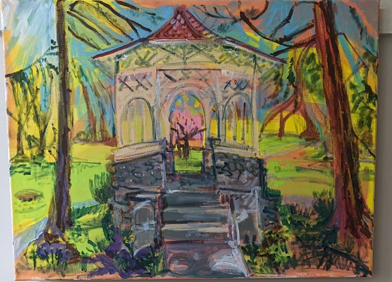 A beautiful fauvist piece that will brighten your day. This gazebo is in Newburyport, but it could be anywhere, even in your dreams. This piece was painted en plein air on a beautiful day at Atkinson Commons in Newburyport; and I really felt like it was aglow on this day. I was so happy to paint outside in one of my favorite spots and I hope that it comes through in this artwork.
