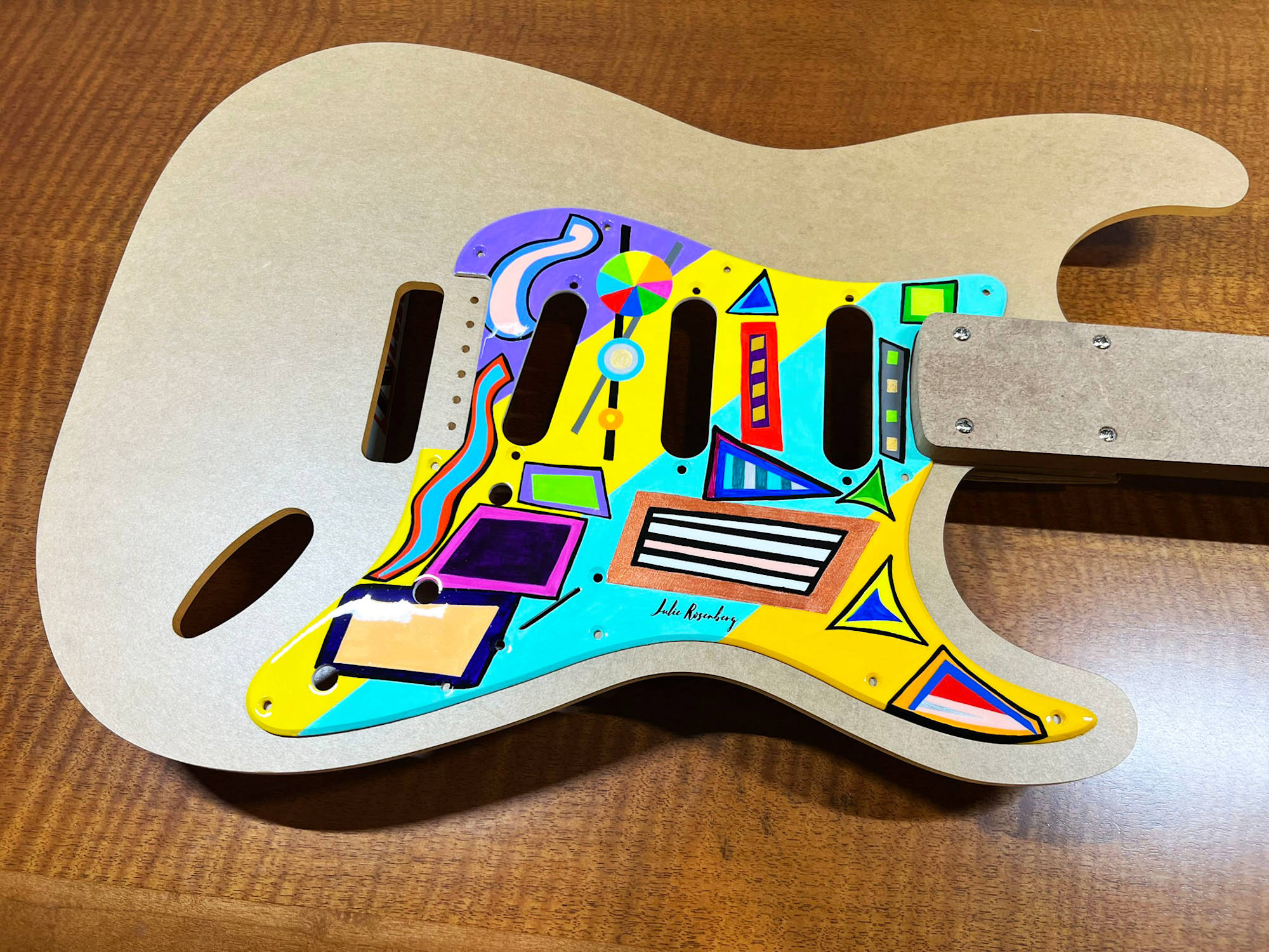 hand-painted acrylic guitar pickguard mounted on acrylic guitar body template attached to MDF neck template