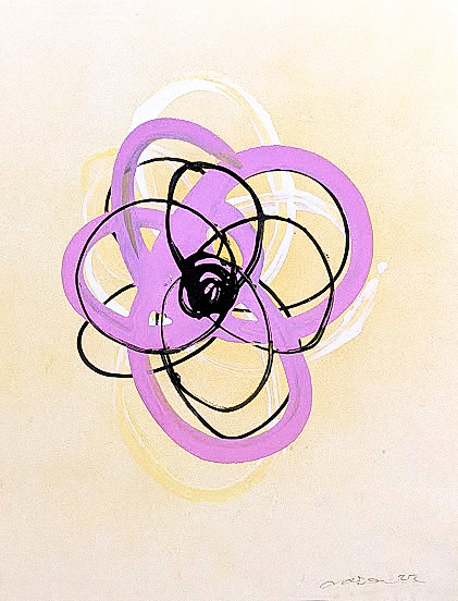 "Pink & Yellow Empyreal Floral" spins a delightful tale of artistic alchemy, where graffiti markers, spray paint, and gesso conspire on paper (mounted thoughtfully on artboard) to create something rather magical. The piece centers around an intricate dance of loops in purple and black that weave through space like cosmic choreography, their bold gestures playing hide-and-seek with softer, translucent circles that float in the background like friendly ghosts. Against a neutral backdrop that knows precisely when to step back and let the show unfold, the artwork's palette of pinks, yellows, and blacks blooms with the kind of confidence that comes from deep artistic intuition. Born from a practice of meditative painting, these intersecting forms create a visual rhythm that invites viewers to pause and breathe – a gentle reminder that sometimes the most profound conversations happen in the space between chaos and calm. Each curve and loop writes its own chapter in this story of connection and flow, creating a piece that feels both grounded and ethereal, like catching a garden growing in zero gravity.