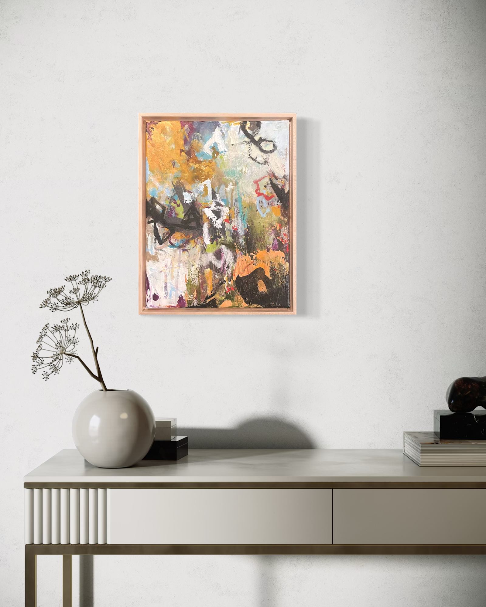 acrylic and paper on canvas, maple frame