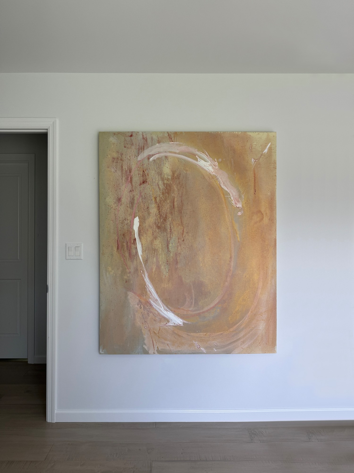 Inspired by nature this dynamic multi-layered earth-toned abstract painting is combining tranquility with a splash of high energy. Tones of gold, yellow, rose and green, reminiscent of golden hour, aiming to bring a subtle sophistication to any interior space.