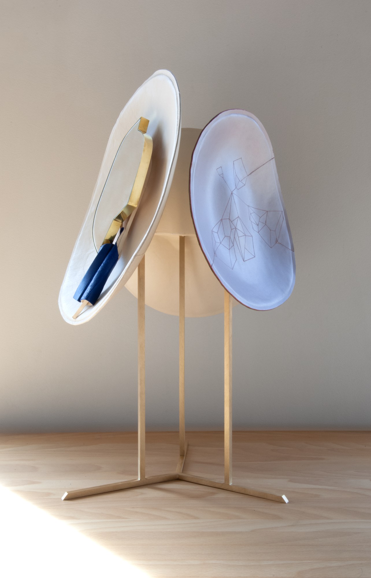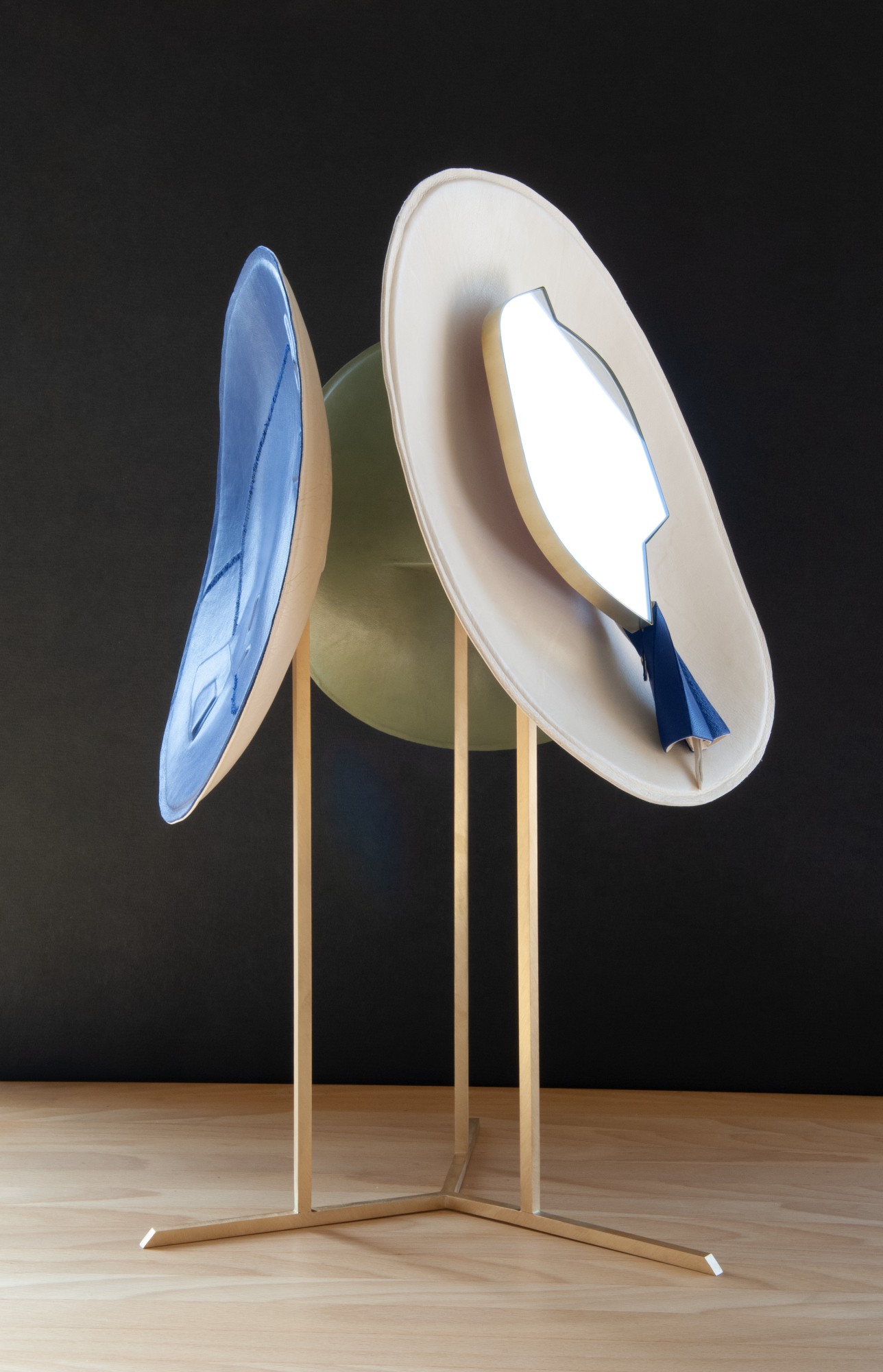 Totem leather sculpture on a brass base, embossings and hot-engravings, small mirror