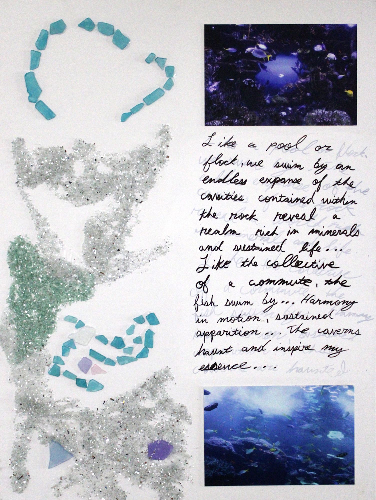 Displayed in a silver aluminum frame. The assemblage incorporates crushed glass, photography, and creative writing into one cohesive work of art. Additionally, the photography in the assemblage utilizes no Photoshop enhancement and is without digital alteration in order to present a documentary approach of a raw image.