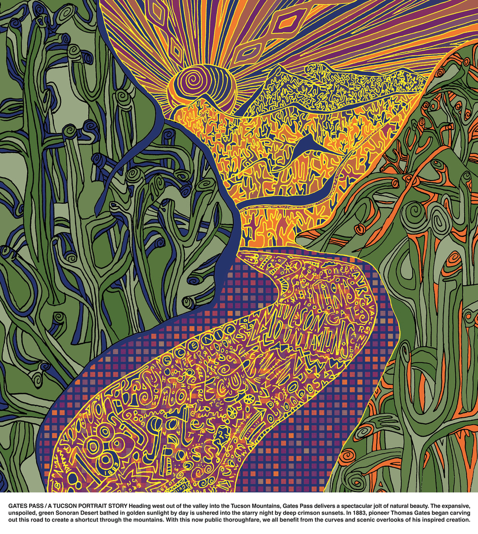 A Tucson Portrait Story is a collection of drawings depicting people, places, and events that make Tucson extraordinary. These include Tucson icons – like Gates Pass, El Tour de Tucson and monsoon rains – along with insightful portraits of Tucson’s diverse population, from street musicians to salsa makers.