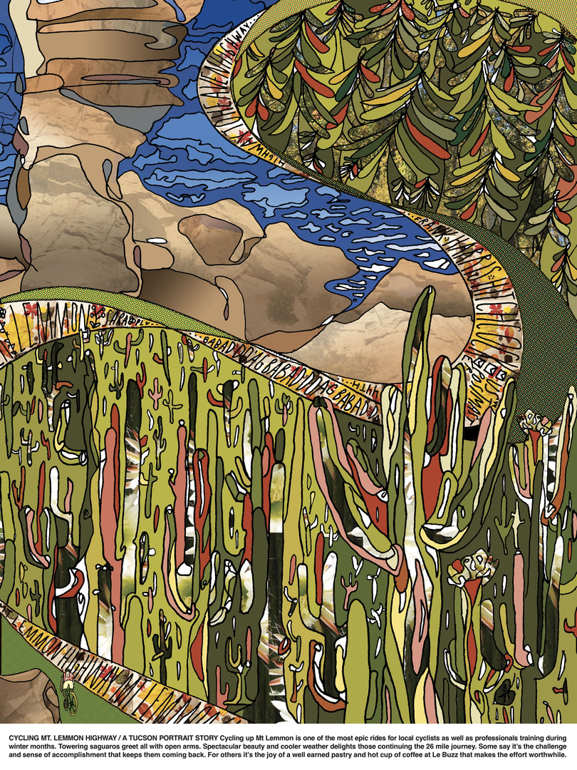 A Tucson Portrait Story is a collection of drawings depicting people, places, and events that make Tucson extraordinary. These include Tucson icons – like Gates Pass, El Tour de Tucson and monsoon rains – along with insightful portraits of Tucson’s diverse population, from street musicians to salsa makers.