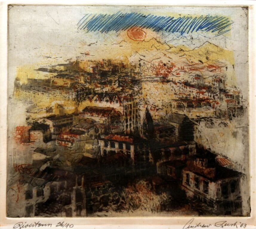 Andrew Rush is a highly regarded American printmaker and art teacher (he formerly taught at the UA College of Art and is a founding member of The Drawing Studio), who received the Lifetime Achievement Award from Tucson Pima Arts Council in 2006. During the year this intaglio was created Rush was active in print exhibitions in Asia, Africa and the Soviet Union.
