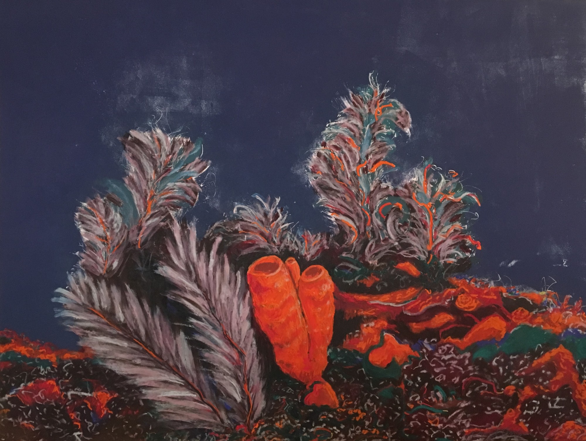 David Andres is the Director of the Louis Carlos Bernal Gallery at Pima Community College. To make this monotype, he photographed images while scuba diving in the Sea of Cortez north of San Carlos, Mexico. He made contour drawings from the photographs, then applied oil ink on a Plexiglass plate that he ran through a press. To finish the work he added soft pastel.