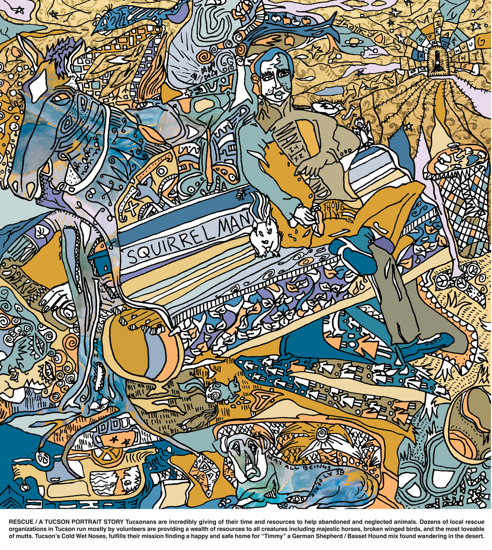 A Tucson Portrait Story is a collection of drawings depicting people, places, and events that make Tucson extraordinary. These include Tucson icons – like Gates Pass, El Tour de Tucson and monsoon rains – along with insightful portraits of Tucson’s diverse population, from street musicians to salsa makers.