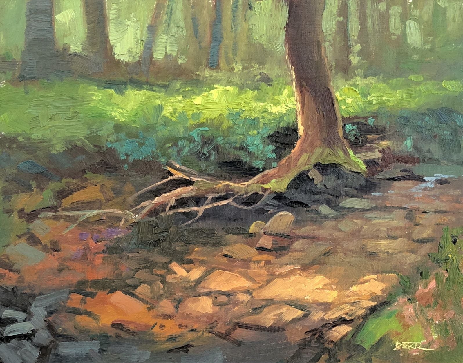 From there, I wandered along a forest service road that runs beside a quaint little stream called Spring Creek. Stopped at a campsite pullout and found this smaller stream and the undercut roots of a tree that always make for interesting paintings.