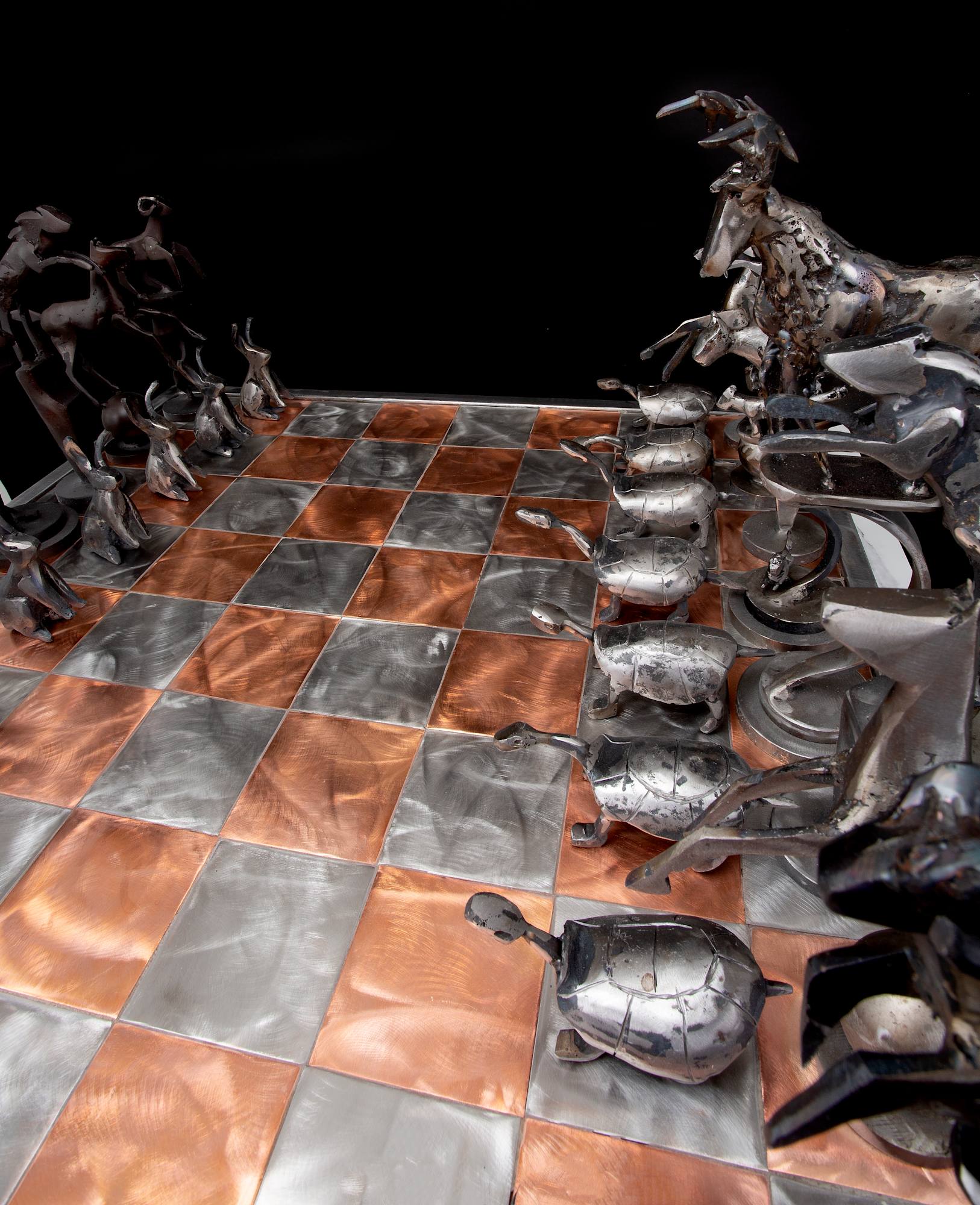 Tolley’s chess set, “Yellowstone”, features animals of North America. Wolves, bison, elk, pumas, horses and bears roam among hares and tortoises across a field of copper and steel. Tolley combines new and old metal techniques into a fresh vision of the future.