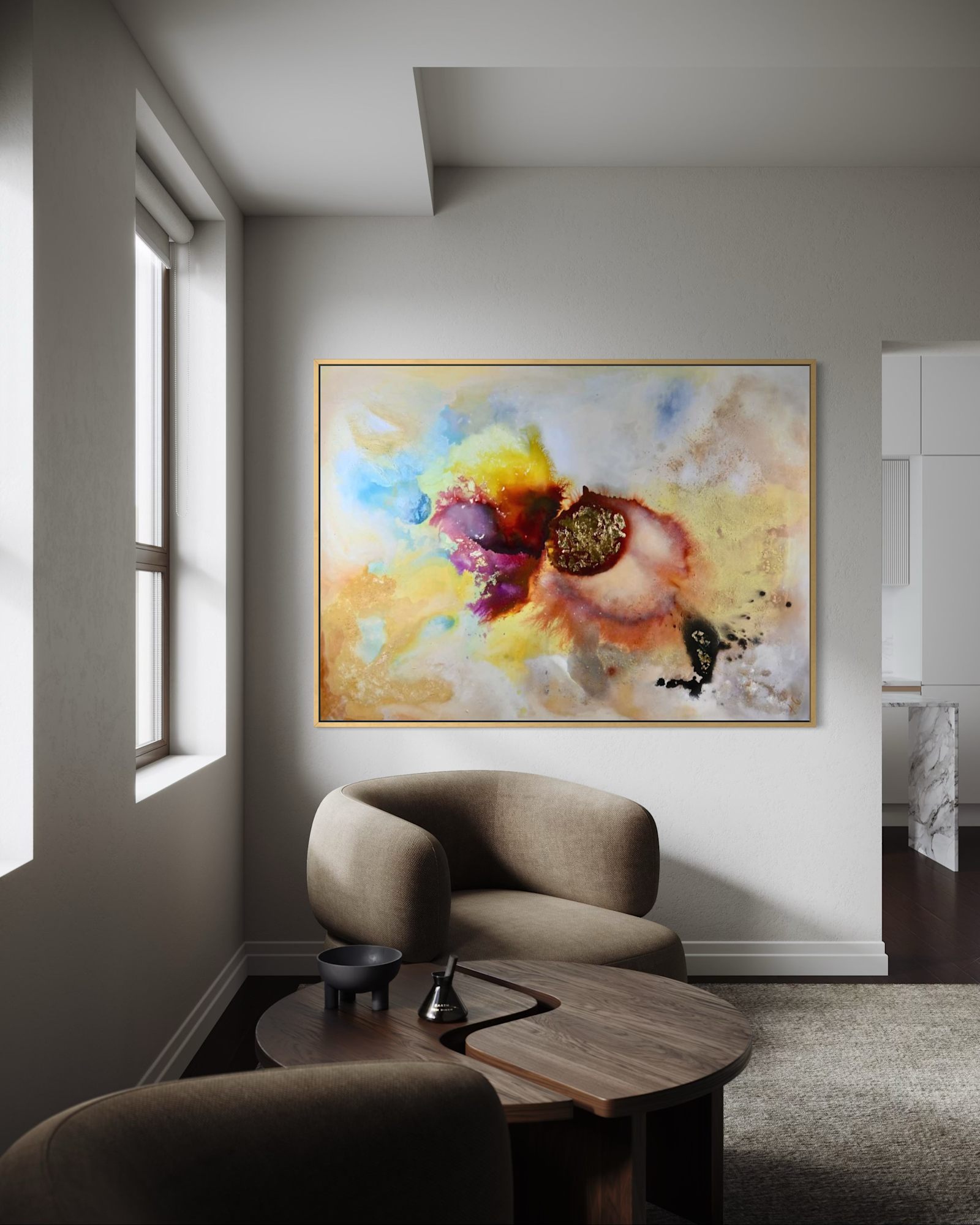 Das Werk Goldfrucht entfaltet auf großzügigem Format eine dynamische Komposition, die durch kräftige Farbfelder in Gelb, Rot, Violett und Schwarz geprägt ist. In der Bildmitte bildet eine von Blattgold akzentuierte Form das visuelle Zentrum, umgeben von organisch verlaufenden Farbstrukturen und sanften Übergängen ins Helle. Die Kombination von Acryl, Tusche und Blattgold erzeugt ein vielschichtiges Spannungsfeld zwischen Transparenz und Dichte, Leuchten und Erdung. Die Arbeit wirkt zugleich energetisch und harmonisch, wobei die goldene Mitte als Fruchtkörper interpretiert werden kann, der kraftvoll im Raum zu schweben scheint.