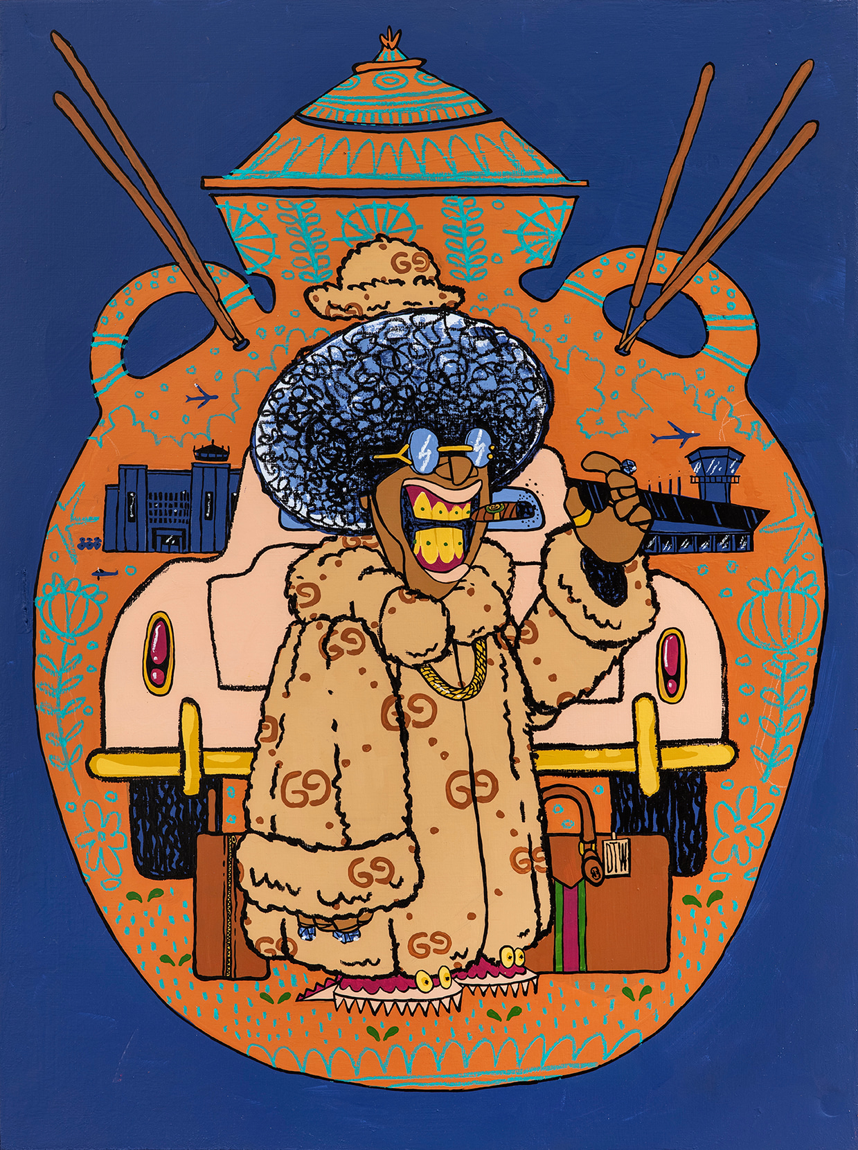 Serving as a visual narrative inspired by Martin Lawrence's character, Jerome 'Playa from the Himalayas.' This piece explores themes of cultural juxtaposition, personal transformation, and the allure of luxury. Set in the 1970s, the painting portrays the bustling Detroit City Airport as a symbolic gateway, representing the physical and metaphorical return from a distant land. Jerome, adorned in opulent Gucci fur and accompanied by lavish luggage, stands confidently amidst the airport, his pink Gators and cigar symbolizing individuality and self-expression. By juxtaposing extravagant fashion with the gritty reality of the airport, the artwork invites viewers to contemplate the complexities of personal growth and the transformative power of embracing one's true self and character.