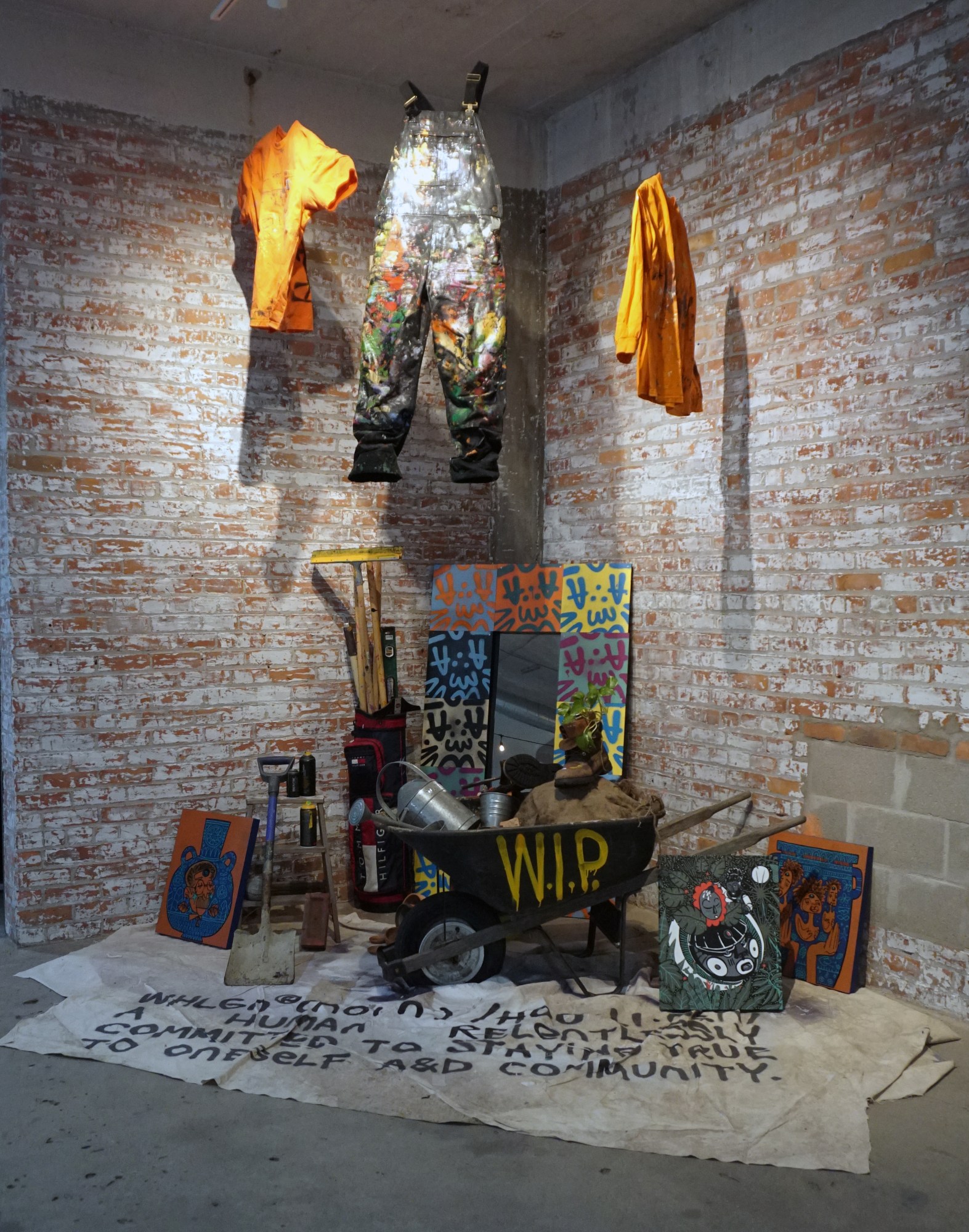 The mirror serves as a tool to encourage self-reflection, inviting participants to engage with the installation in a contemplative manner. In addition, textile garments such as overalls and T-shirts, covered in paint from murals painted in the past five years, are included to represent the work that has been done. The installation also features unhung paintings, symbolizing the work that needs to be done and the ongoing process of growth and development.