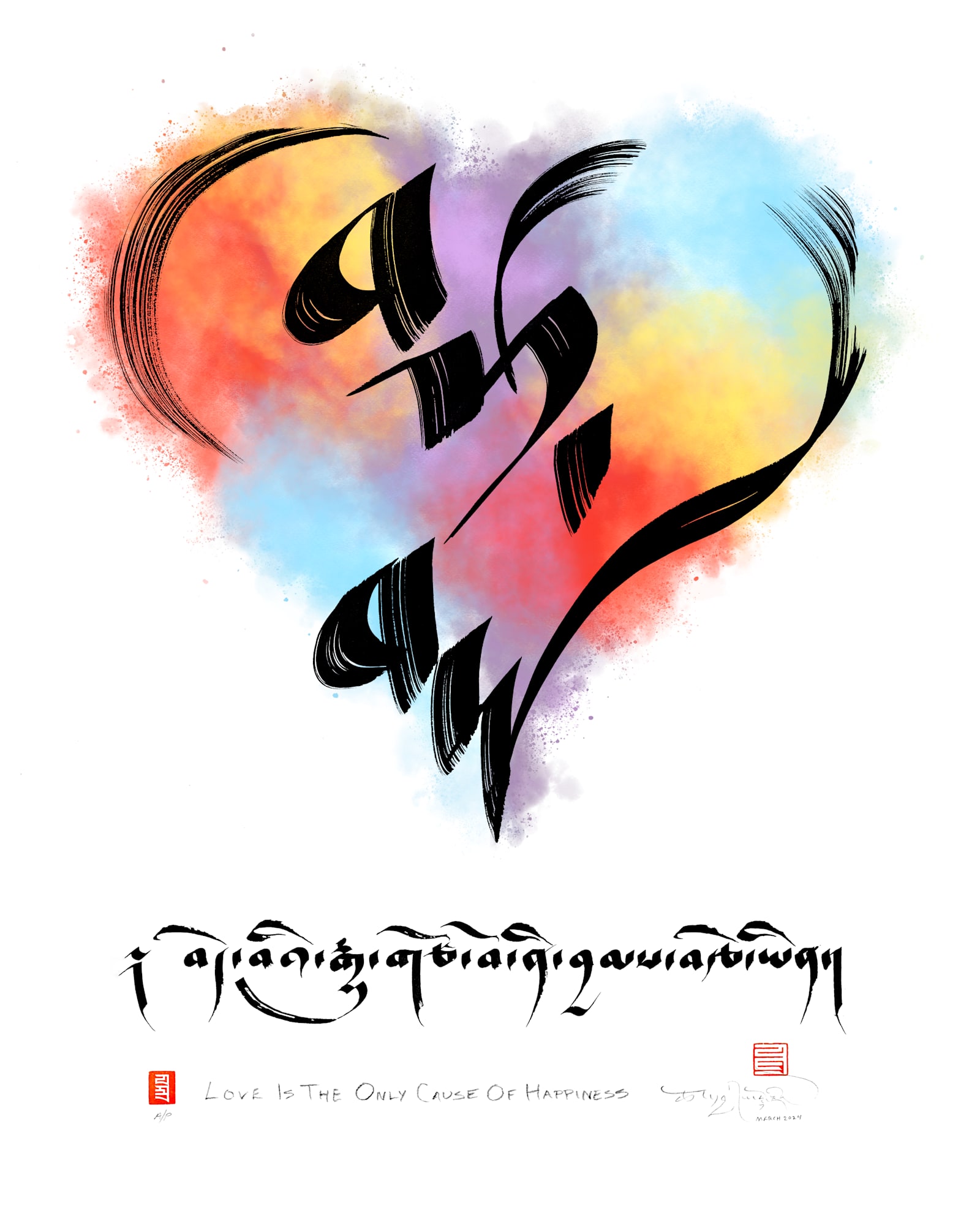 This artwork of Tibetan Calligraphy was originally commissioned by True Colors Flint Hills and inspired by a Dharma teaching from His Eminence Garchen Triptrul Rinpoche that speaks to the heart of this exhibition. My hope is that it can serve as a reminder that showing genuine, unbiased love and compassion to yourself and others can be a powerful method to achieving happiness, both personally and as a society at large.
