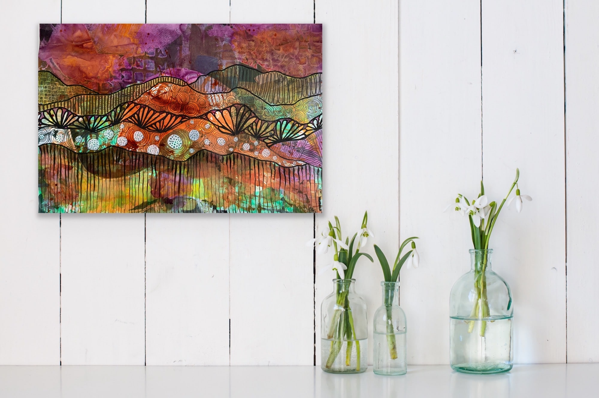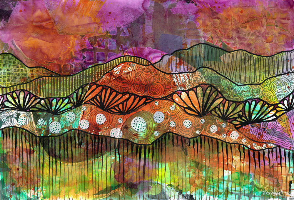 The idea for these pieces had been playing out in a number of ways in my journal, and called for further exploring. I love the look of mountains in the distance, the way they each layer as they get farther away, how each layer has a different colour, a different character. The landscapes are an attempt to explore the calls of those layers and the distance, to look further afield - to look beyond the micro, beyond what’s close, detailed and intimate and towards the horizon, the future - what else could be out there? What lies beyond?