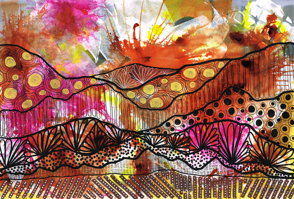 The idea for these pieces had been playing out in a number of ways in my journal, and called for further exploring. I love the look of mountains in the distance, the way they each layer as they get farther away, how each layer has a different colour, a different character. The landscapes are an attempt to explore the calls of those layers and the distance, to look further afield - to look beyond the micro, beyond what’s close, detailed and intimate and towards the horizon, the future - what else could be out there? What lies beyond?