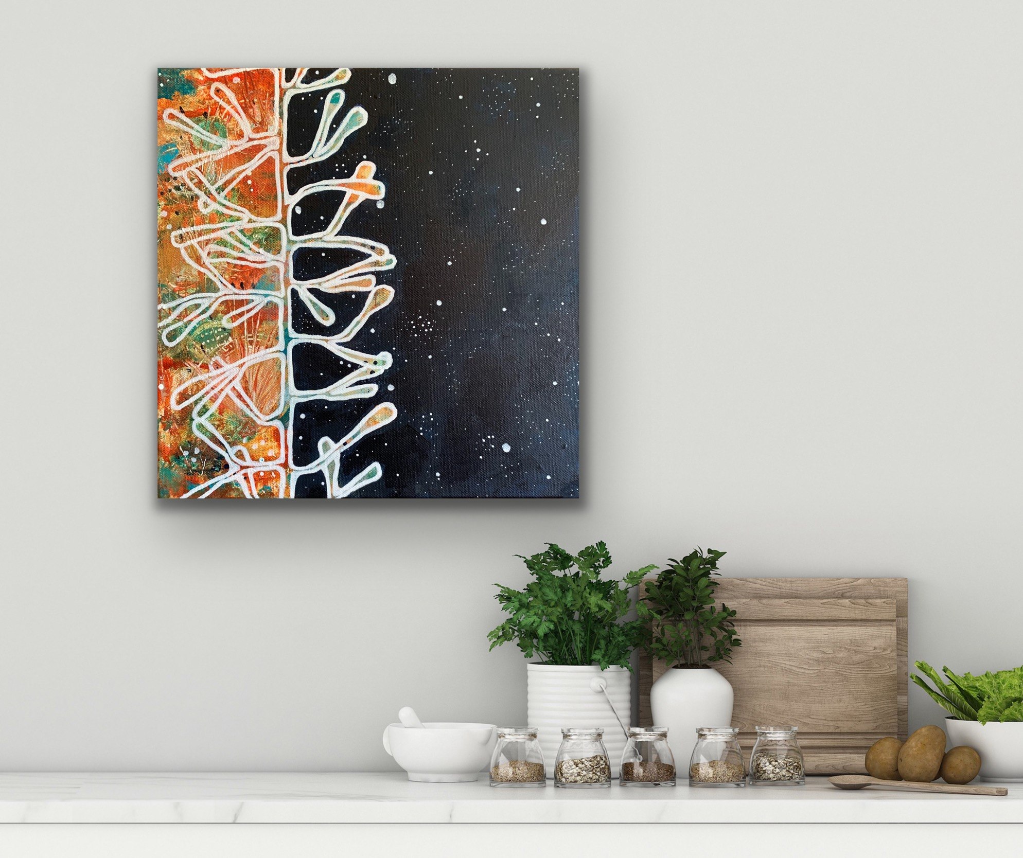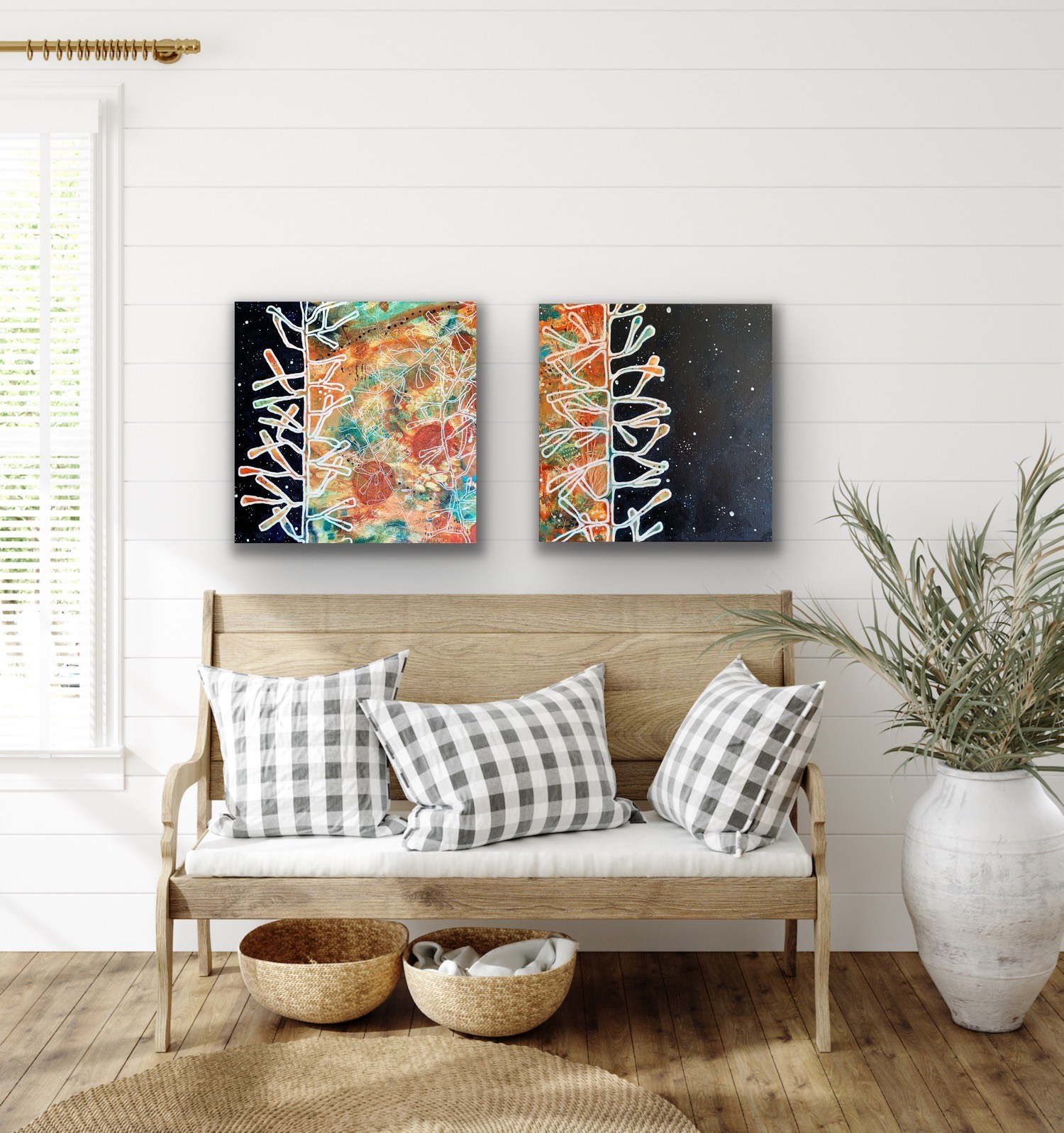 The orientation of this piece is quite intentional - some viewers may sense a horizon line along the botanical form, and want to view it turned 90°. For me, that straight line reads like the straight road that crosses the desert, with the flora running alongside. It's about day giving way to night - a sequence, like turning the page of a book, which is a left/right thing, not an over/under thing.