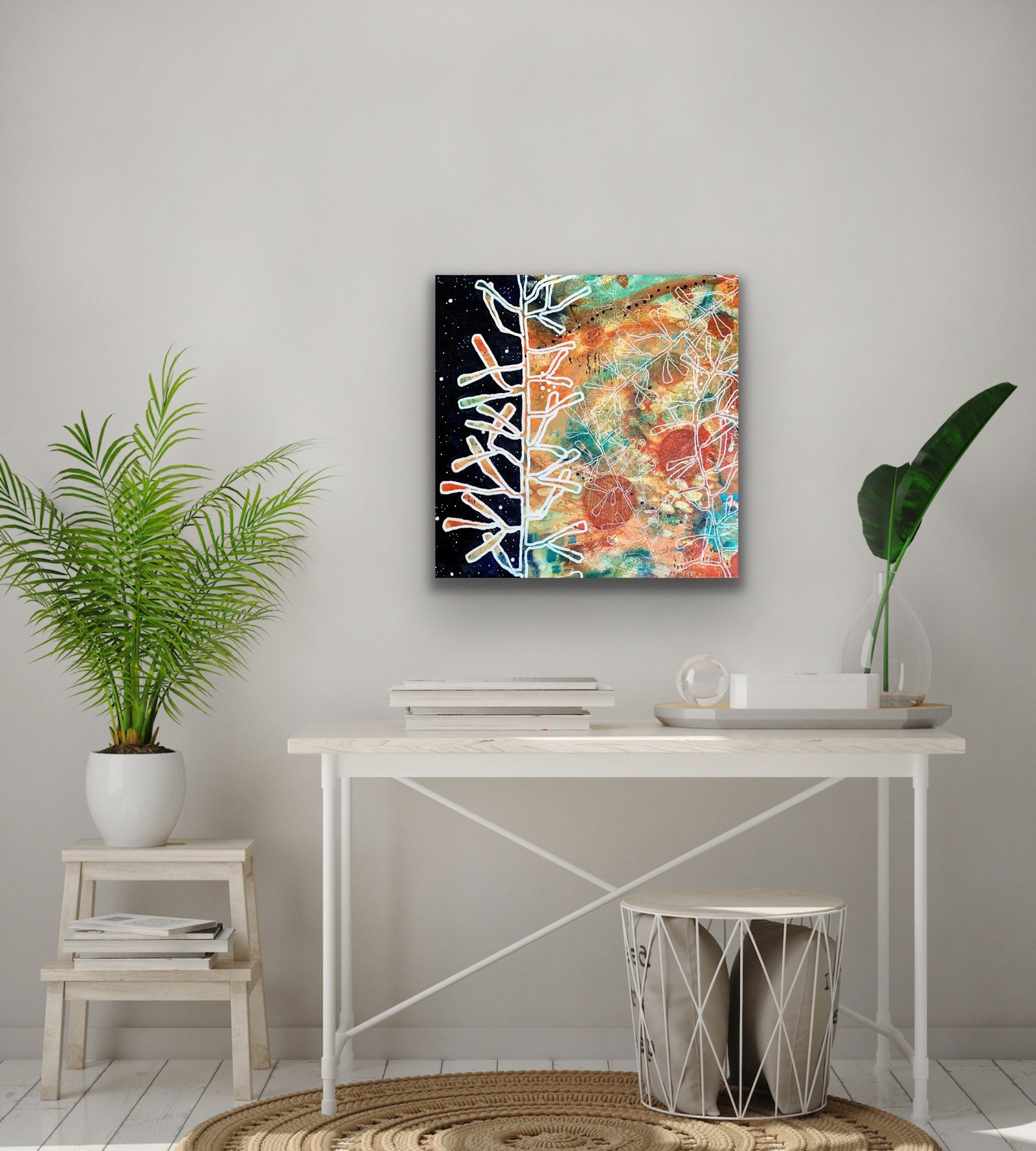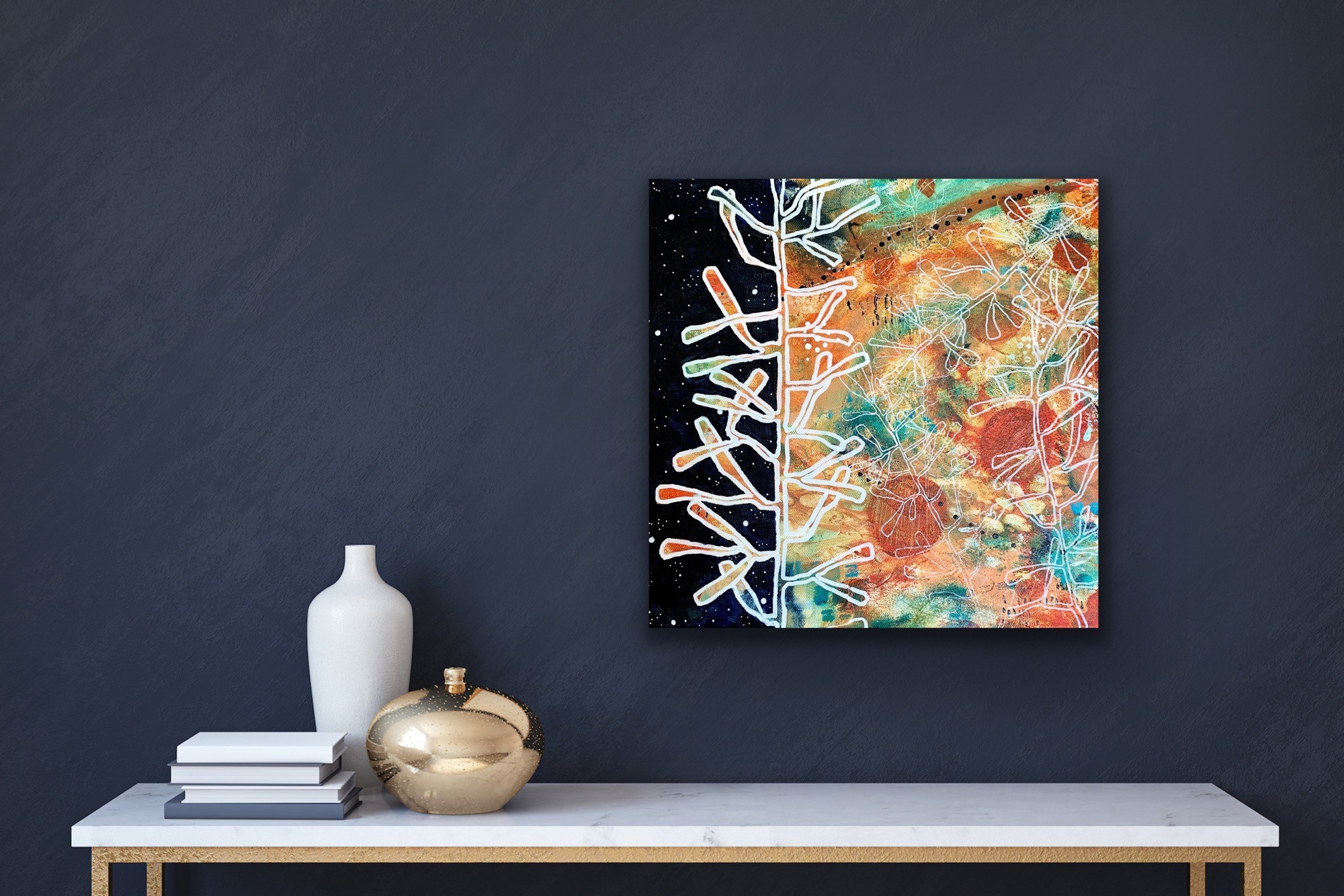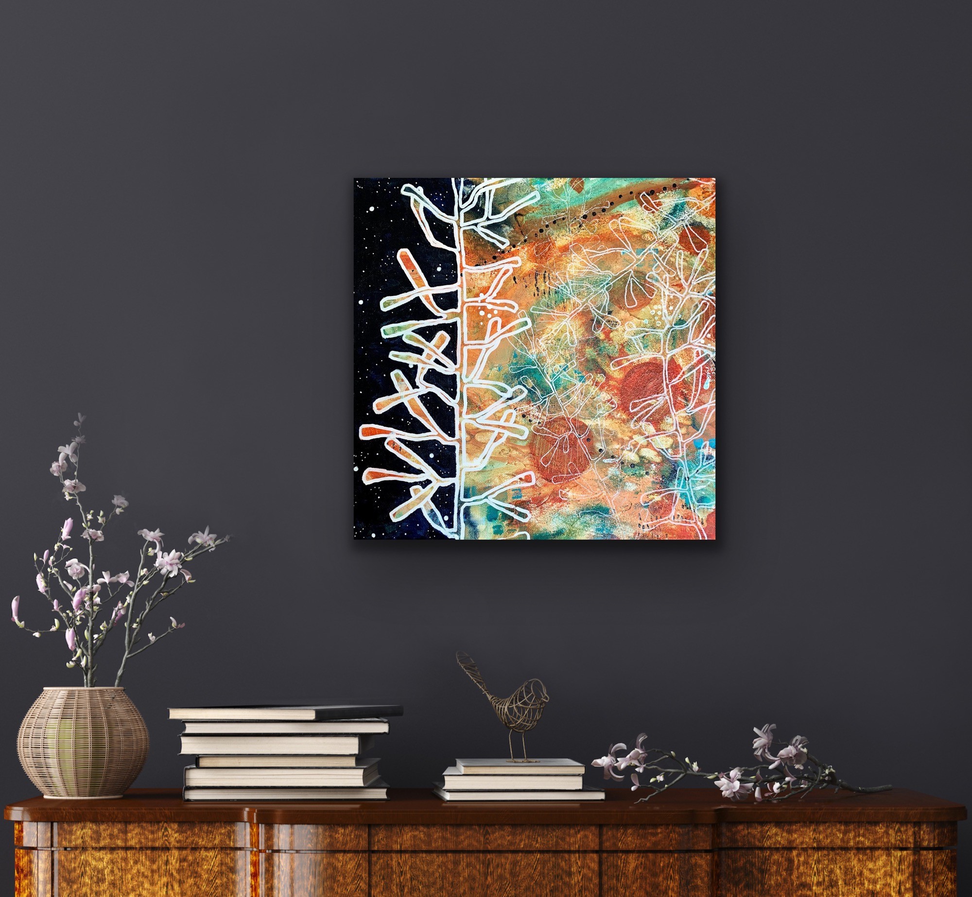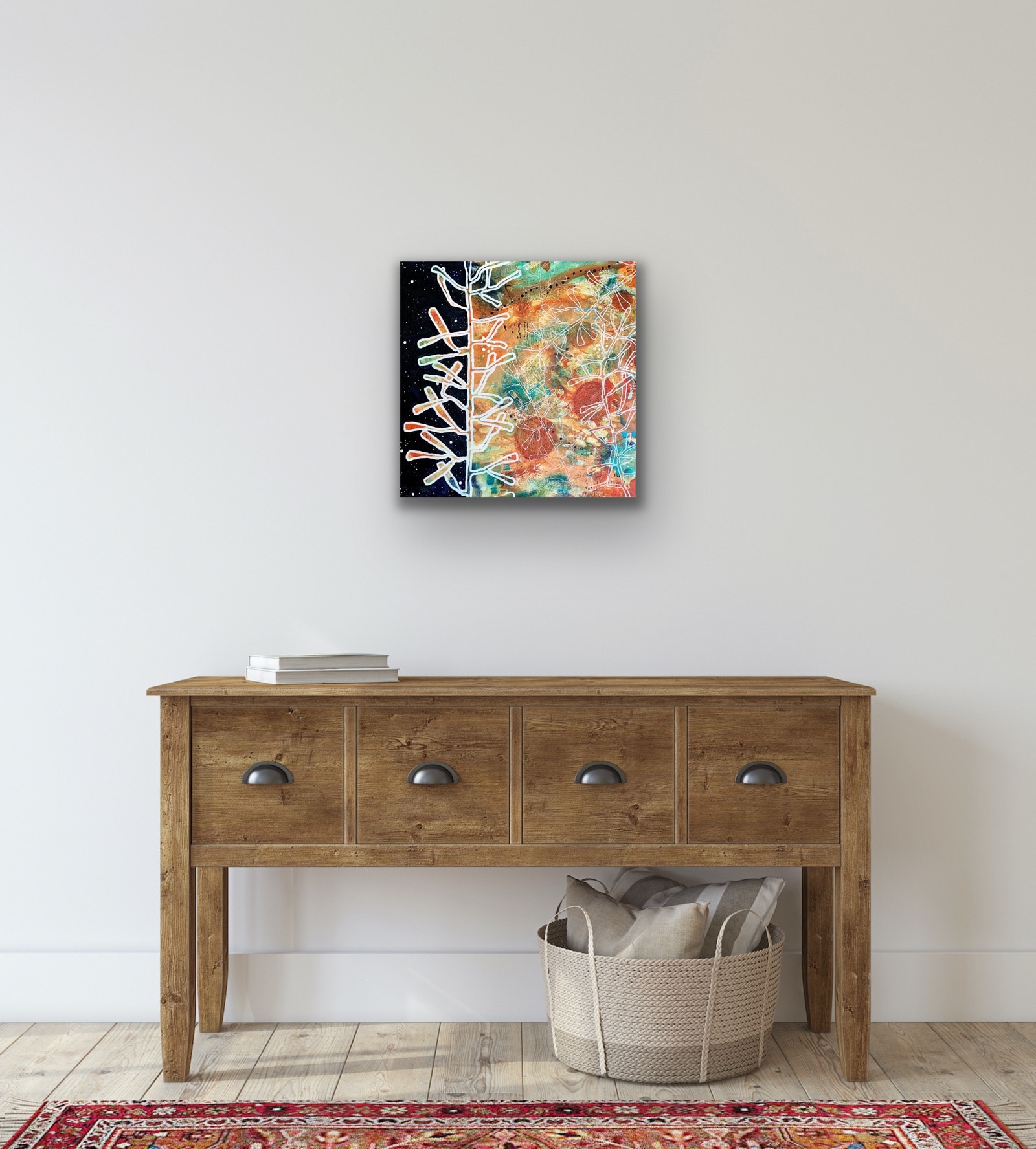 The orientation of this piece is quite intentional - some viewers may sense a horizon line along the botanical form, and want to view it turned 90°. For me, that straight line reads like the straight road that crosses the desert, with the flora running alongside. It's about day giving way to night - a sequence, like turning the page of a book, which is a left/right thing, not an over/under thing.