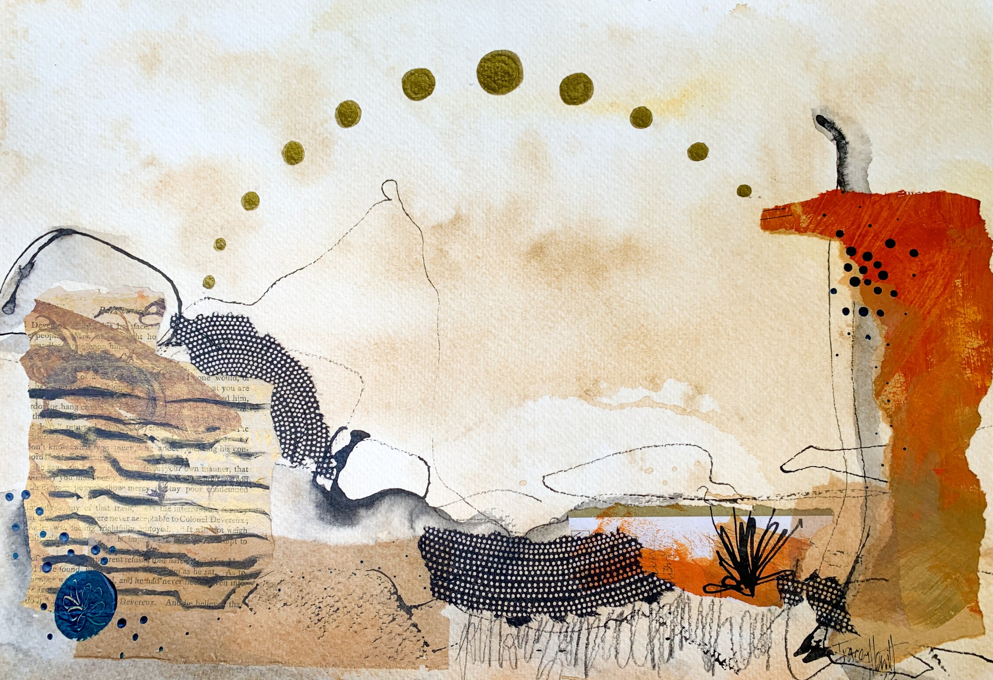 One of 6 ink and collage paintings exploring how to create the feel of vast landscapes and far off horizons in two dimensions.