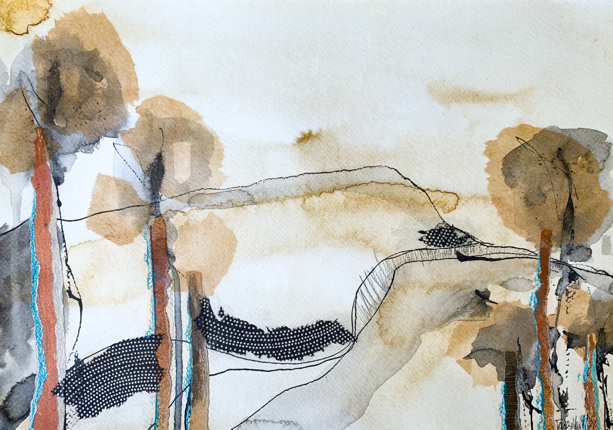 One of 6 ink and collage paintings exploring how to create the feel of vast landscapes and far off horizons in two dimensions. The title inspired by the fact that the canopies of the trees in this paintings are actually tea bag tissue.