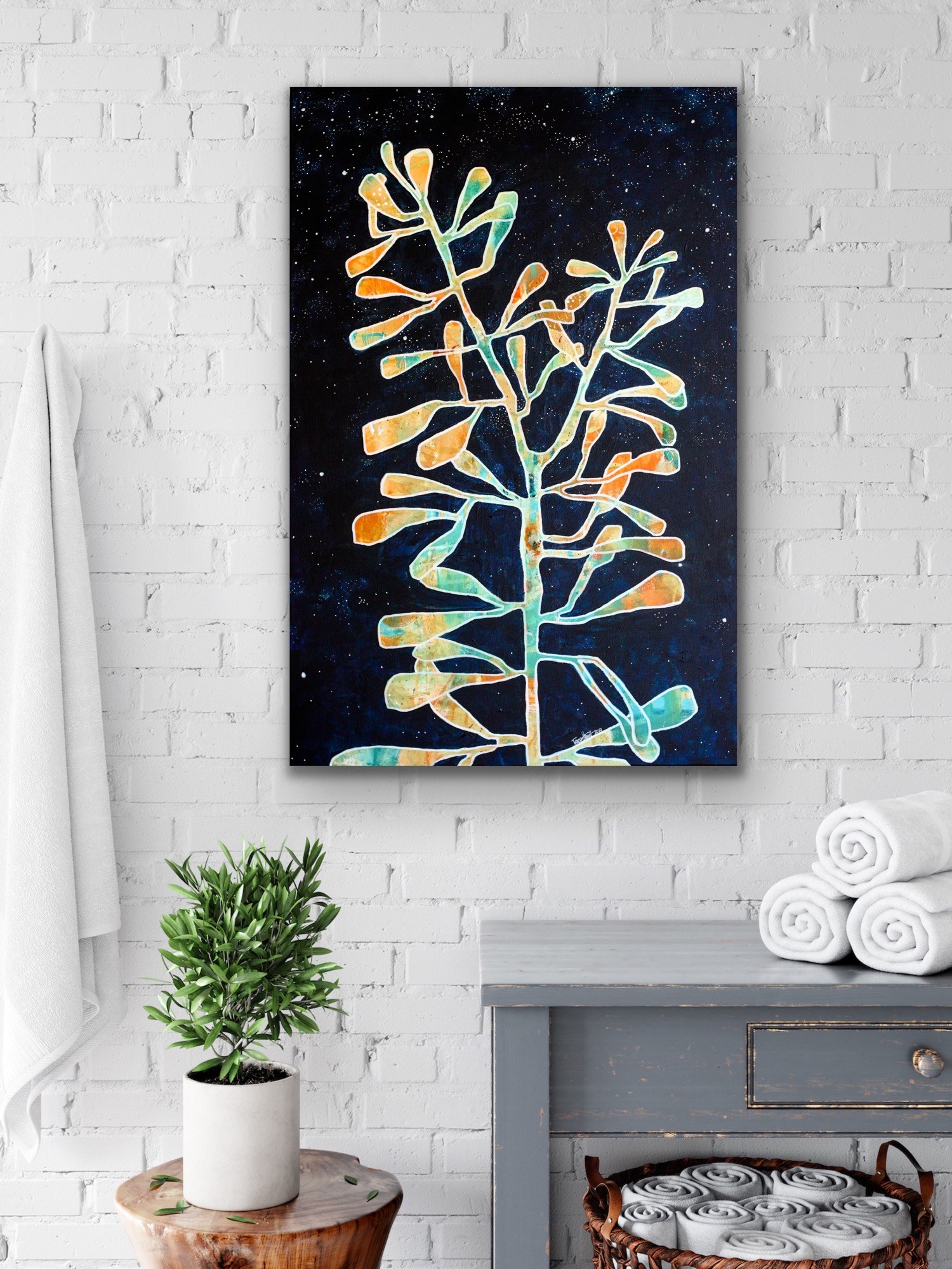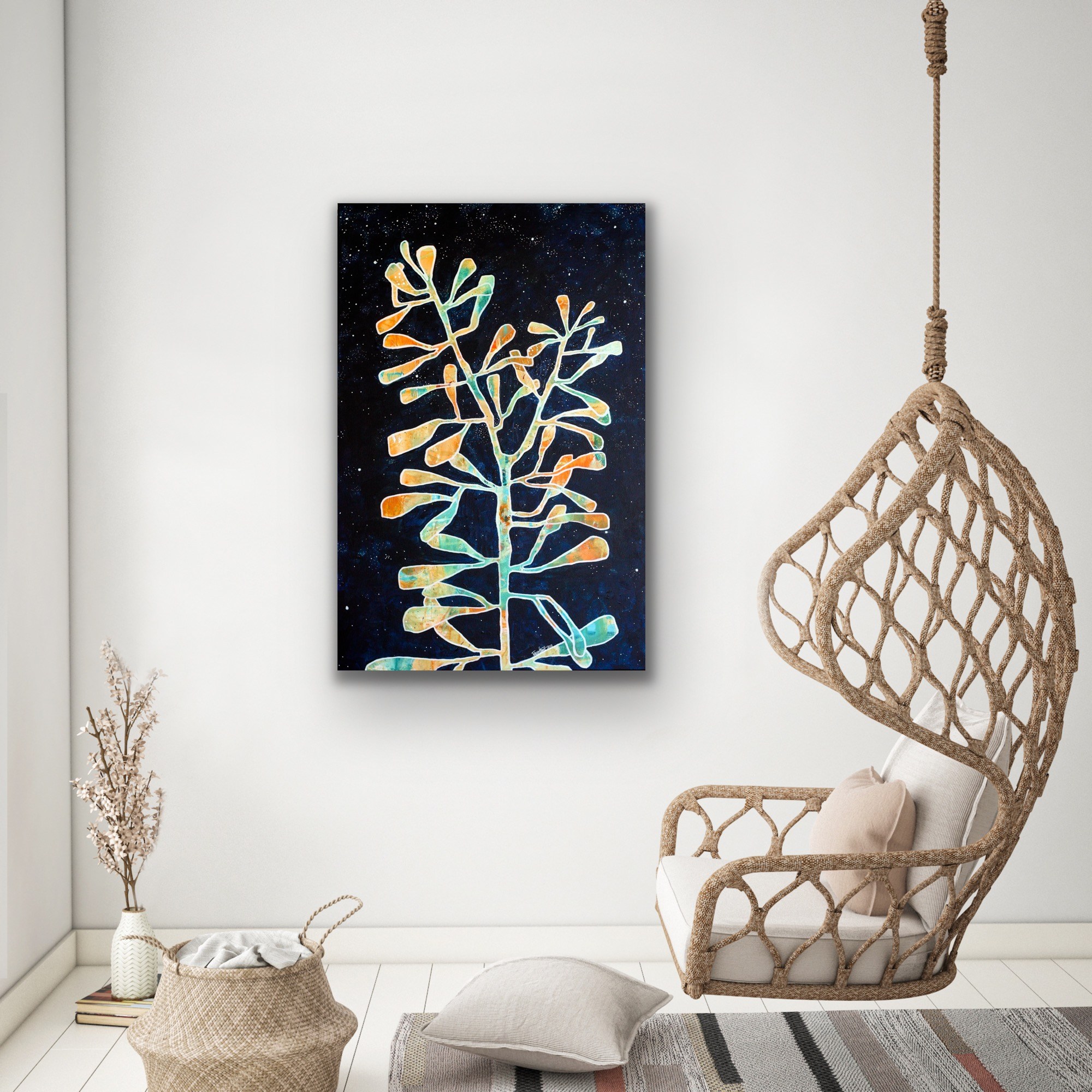 The Silence Of Stars combines and contrasts the form of a scrubby little plant found in our camp, with the vast night skies, and explores the contrast of chaos and calm. Glimpses of the under painting visible through the dark sky areas hint at the things we sense but cannot see.