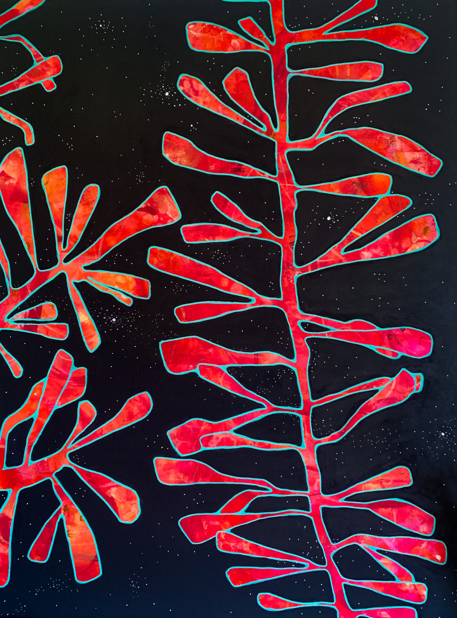 The second Silence Of Stars paintings also combines and contrasts the form of a scrubby little plant found in our camp, with the vast night skies, and explores the contrast of chaos and calm while glimpses of the under painting visible through the dark sky areas hint at the things we sense but cannot see. I was interested to explore how hotter colours, evoking the desert day and sunset might work in this composition.