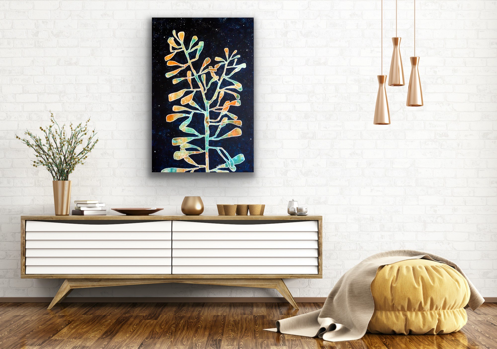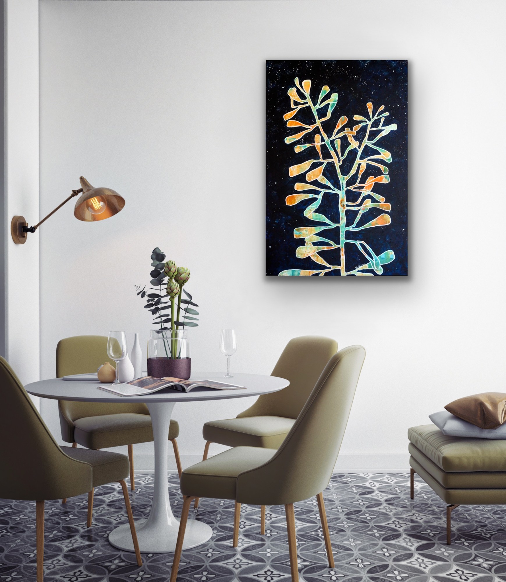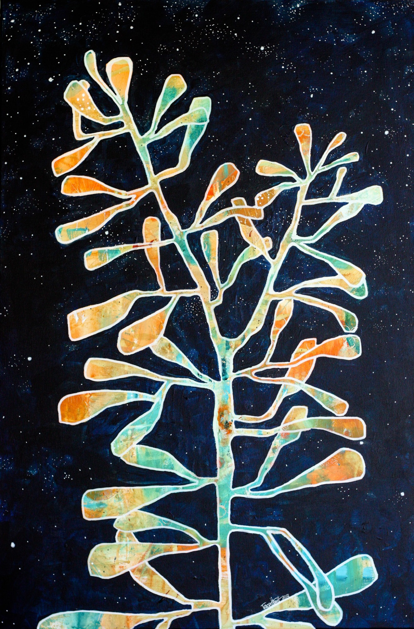 The Silence Of Stars combines and contrasts the form of a scrubby little plant found in our camp, with the vast night skies, and explores the contrast of chaos and calm. Glimpses of the under painting visible through the dark sky areas hint at the things we sense but cannot see.