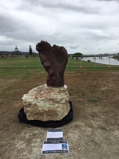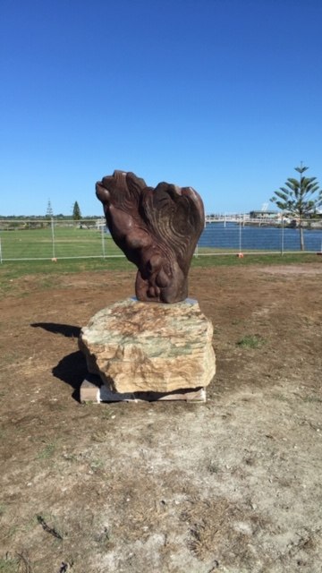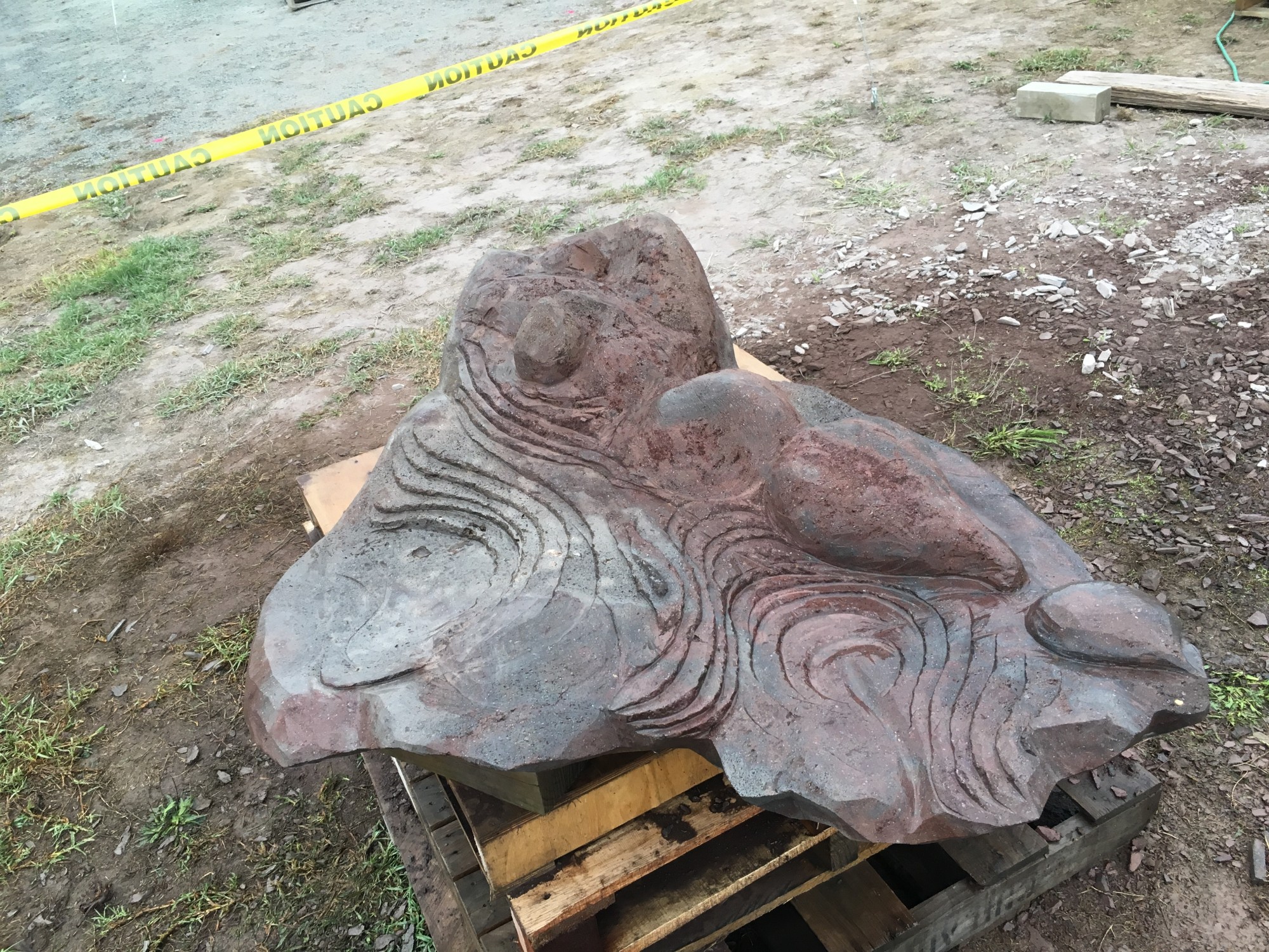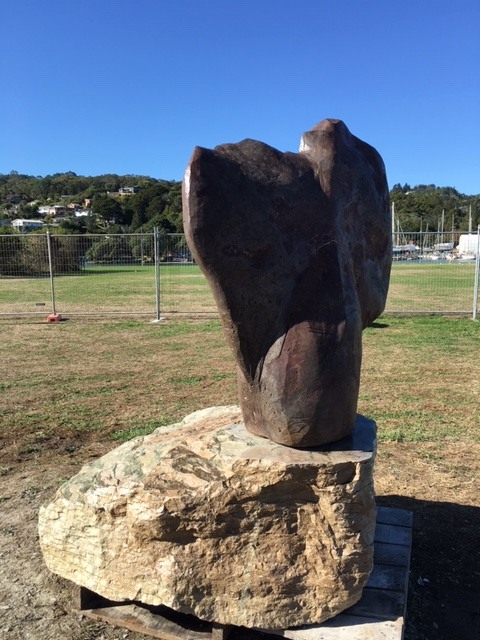 Volcanic stone hand carved into a whale tail form with contours to tell the story of place and ecosystems in relief on the 'underside' of the tail. Mounted onto a Northland hard limestone base.