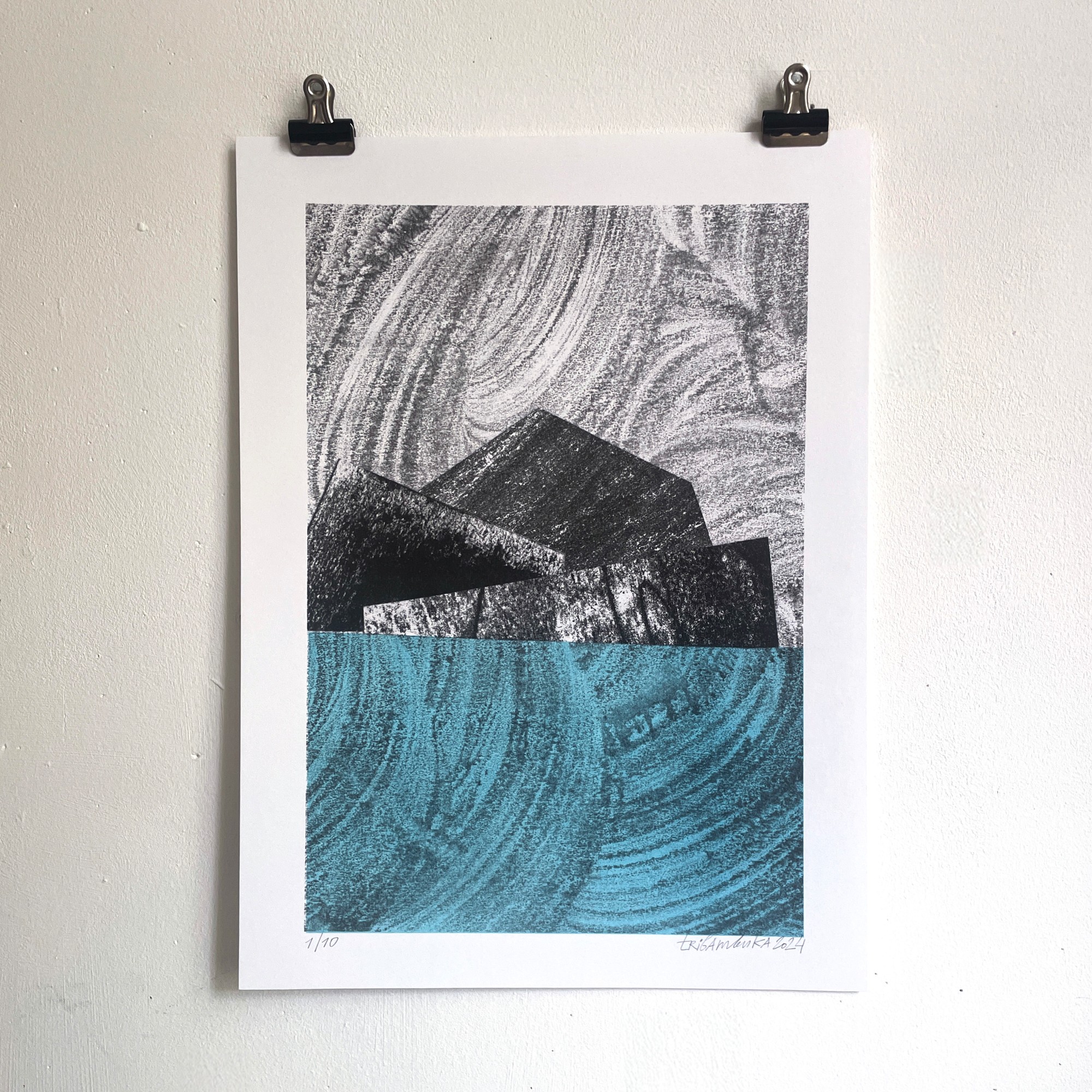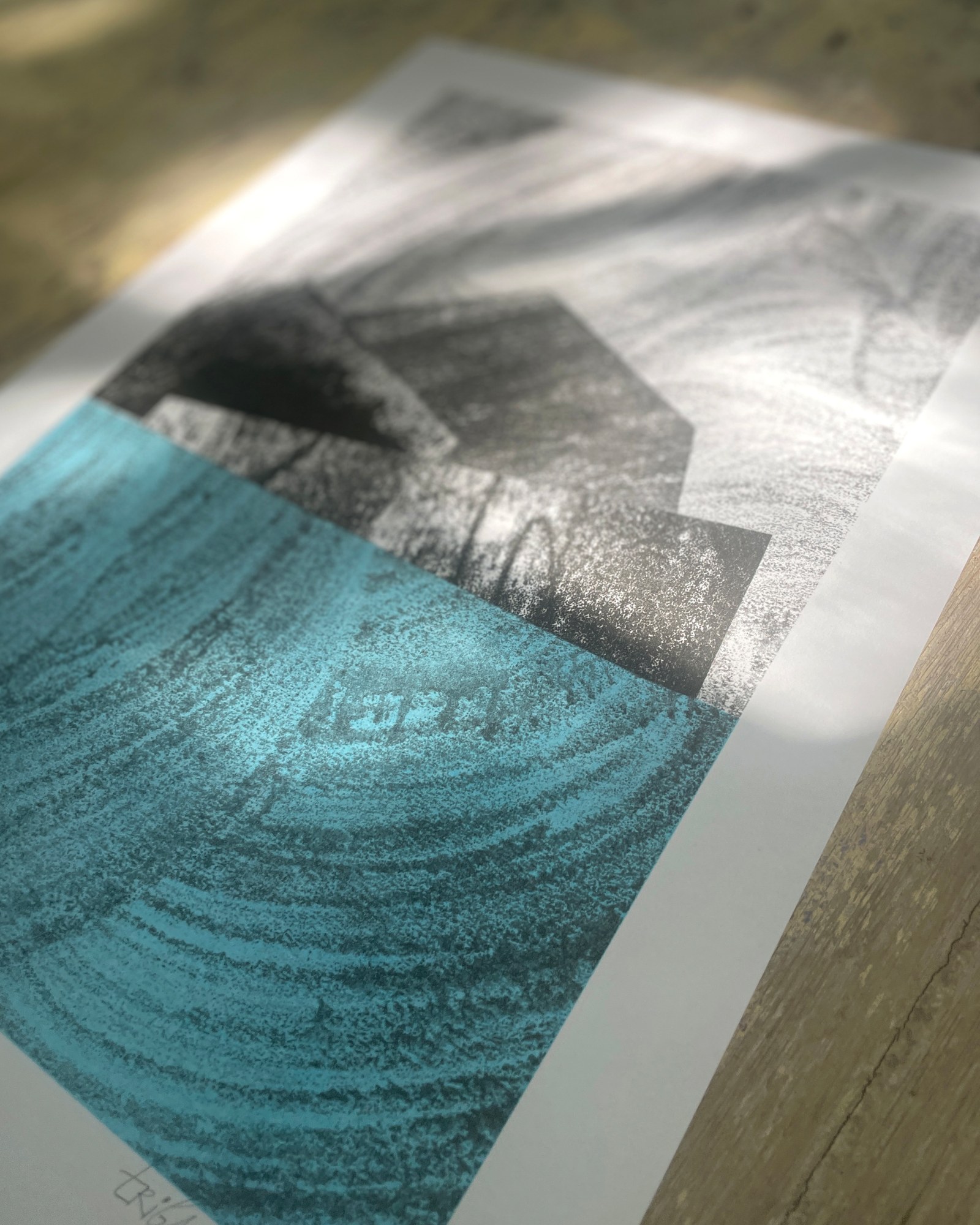 In her latest print series, Echoes of Gomera, Tribambuka channels the untamed spirit of La Gomera into a collection of experimental risograph prints. Created during her art residency on the volcanic island, these prints reflect its rugged, natural beauty through a bold, semi-abstract collage style. Each piece captures the essence of the island’s dramatic landscapes—from the sweeping winds to the craggy contours of ancient lava flows. Employing a monotype process, Tribambuka accentuates the angularity and rich textures of her subjects. The primary use of black, interspersed with striking flashes of fluorescent colors, lends a moody, almost mystical quality to the series, evoking the deep shadows and unexpected bursts of life on the island. Echoes of Gomera invites viewers to experience the profound and stirring wildness that is La Gomera, preserved on paper through the artist's innovative vision.