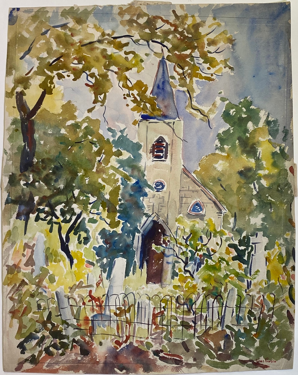 - Church w Blue Steeple and Cemetery