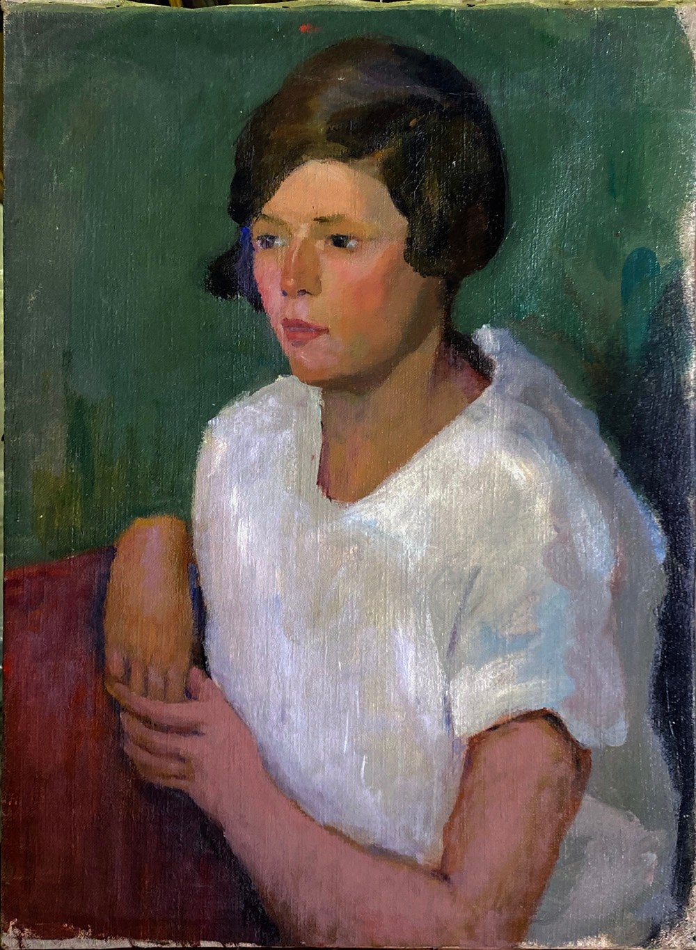 - Portrait of Woman seated in Red Chair with Green background
