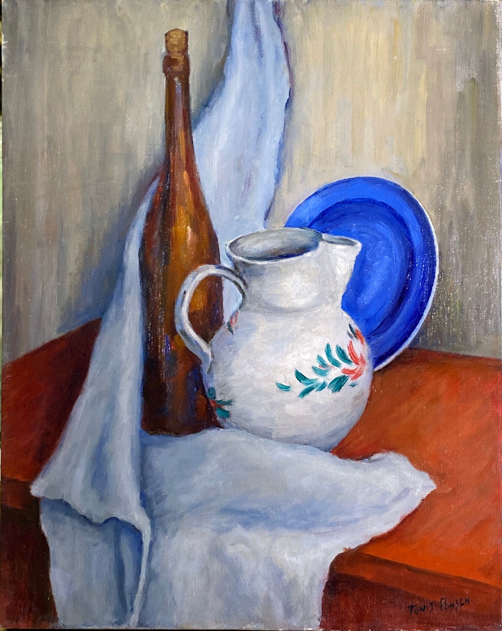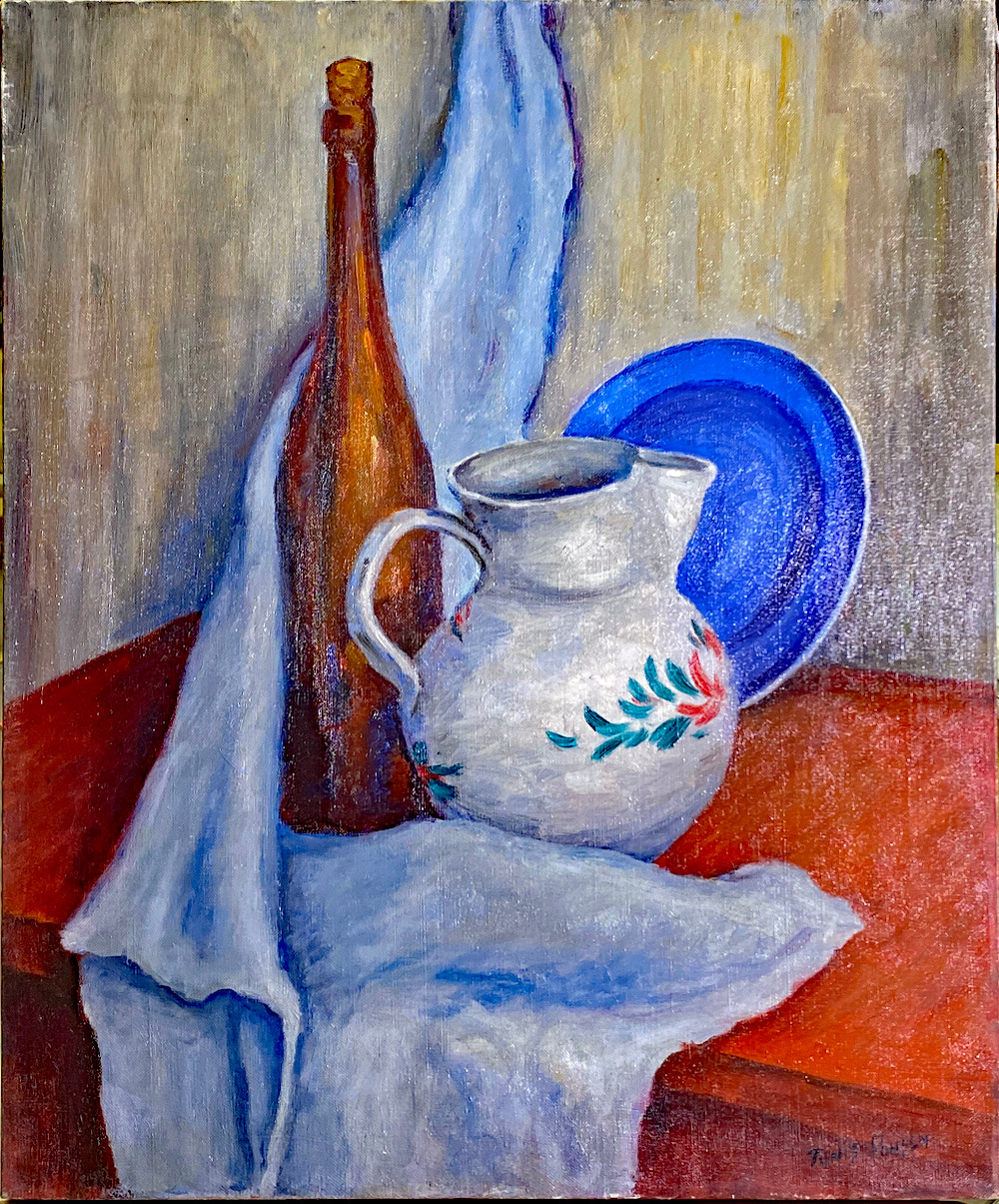 - Still life w Wine Bottle, Blue Plate and Pitcher on Red Table