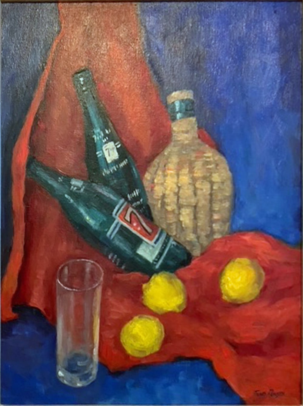 Still Life with 7UP bottles, Lemons, Gin on a Red Drape