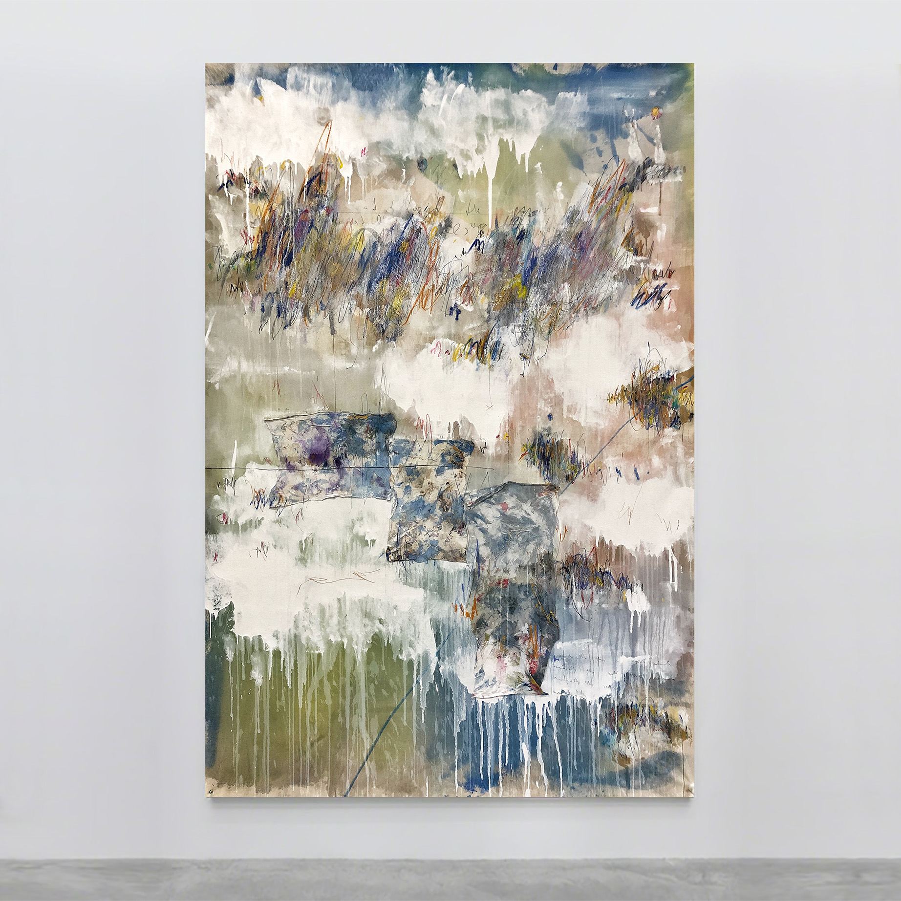 • Acrylic, pastel, oil pastel, graphite, crayon, ink, burlap and cloth on canvas