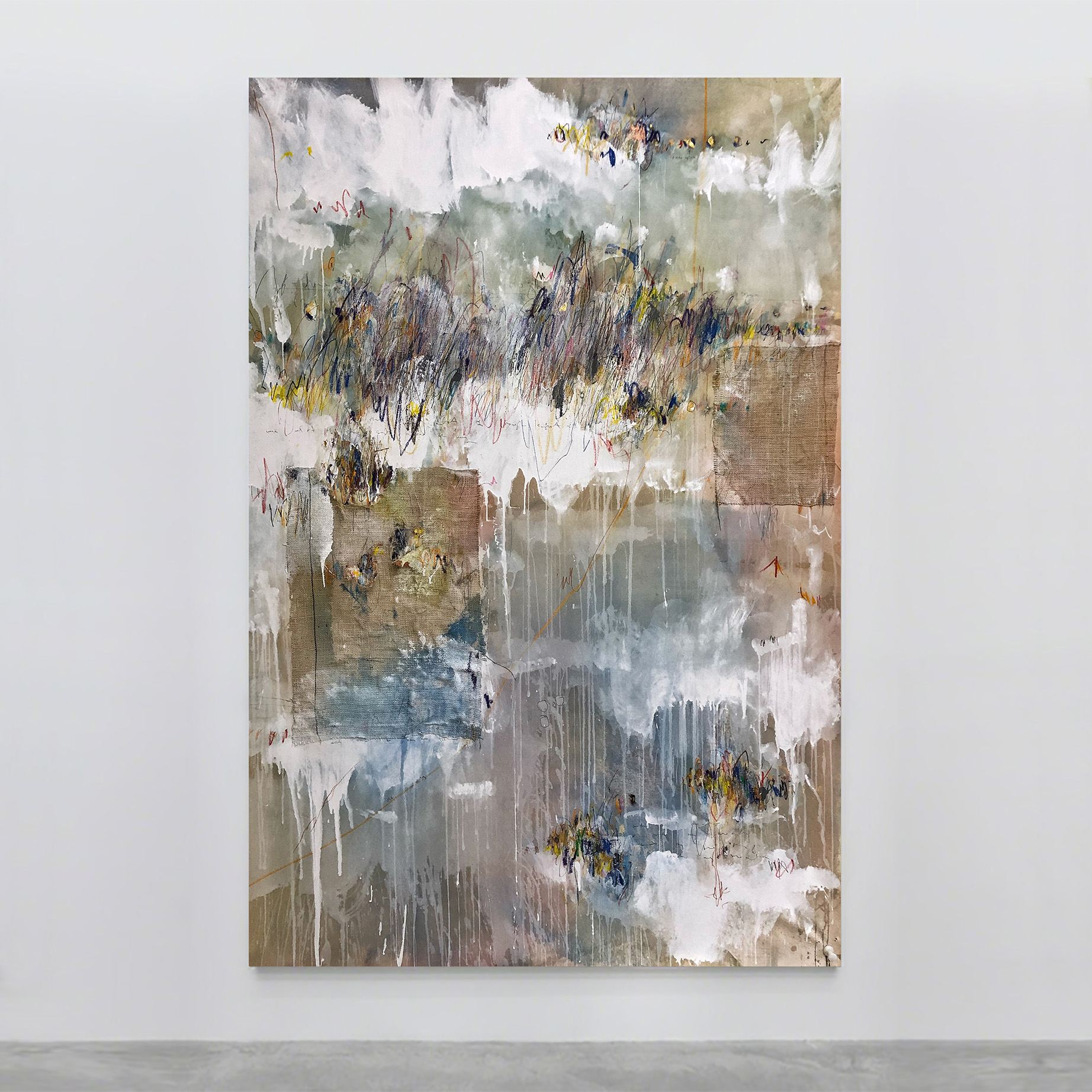 Acrylic, pastel, oil pastel, graphite, crayon, ink, burlap and cloth on canvas