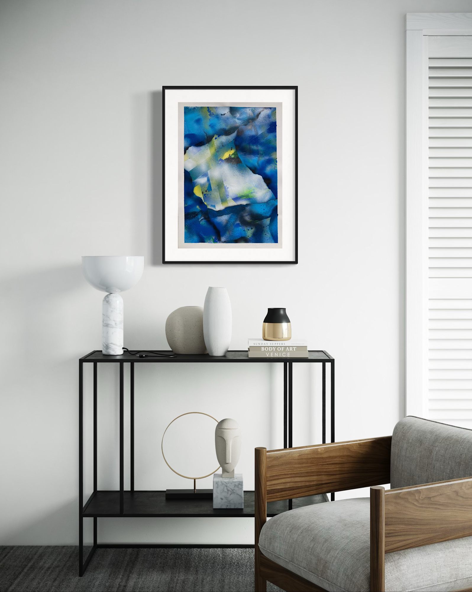 "There is Always Light" symbolizing hope amidst darkness. The canvas is dominated by rich shades of blue, creating a deep, contemplative backdrop. At the center, a burst of white and hints of yellow emerge, representing the ever-present light of hope and new beginnings. This luminous core invites viewers to find solace and inspiration, reassuring them that even in the darkest times, there is always a path to brightness and renewal.