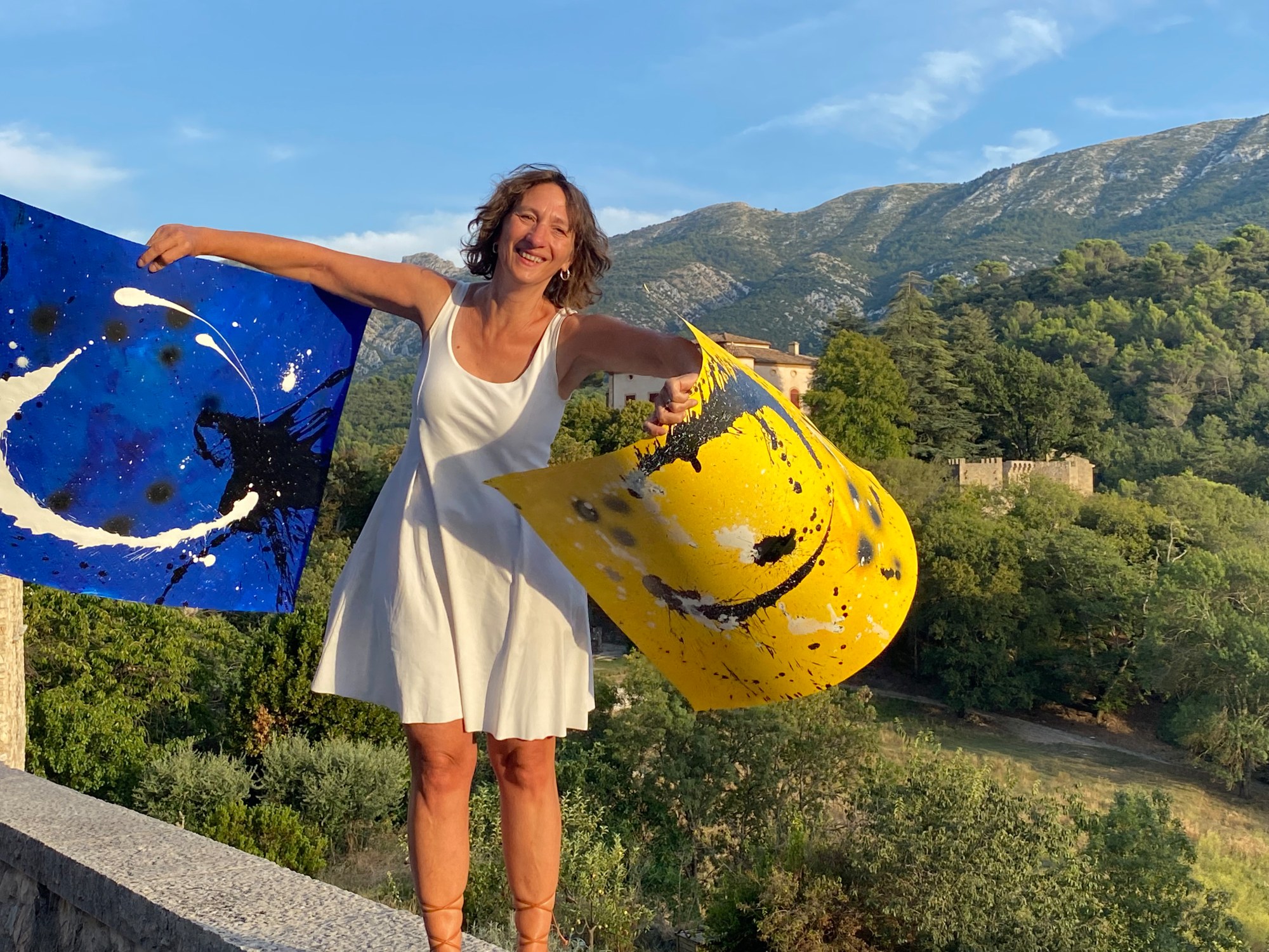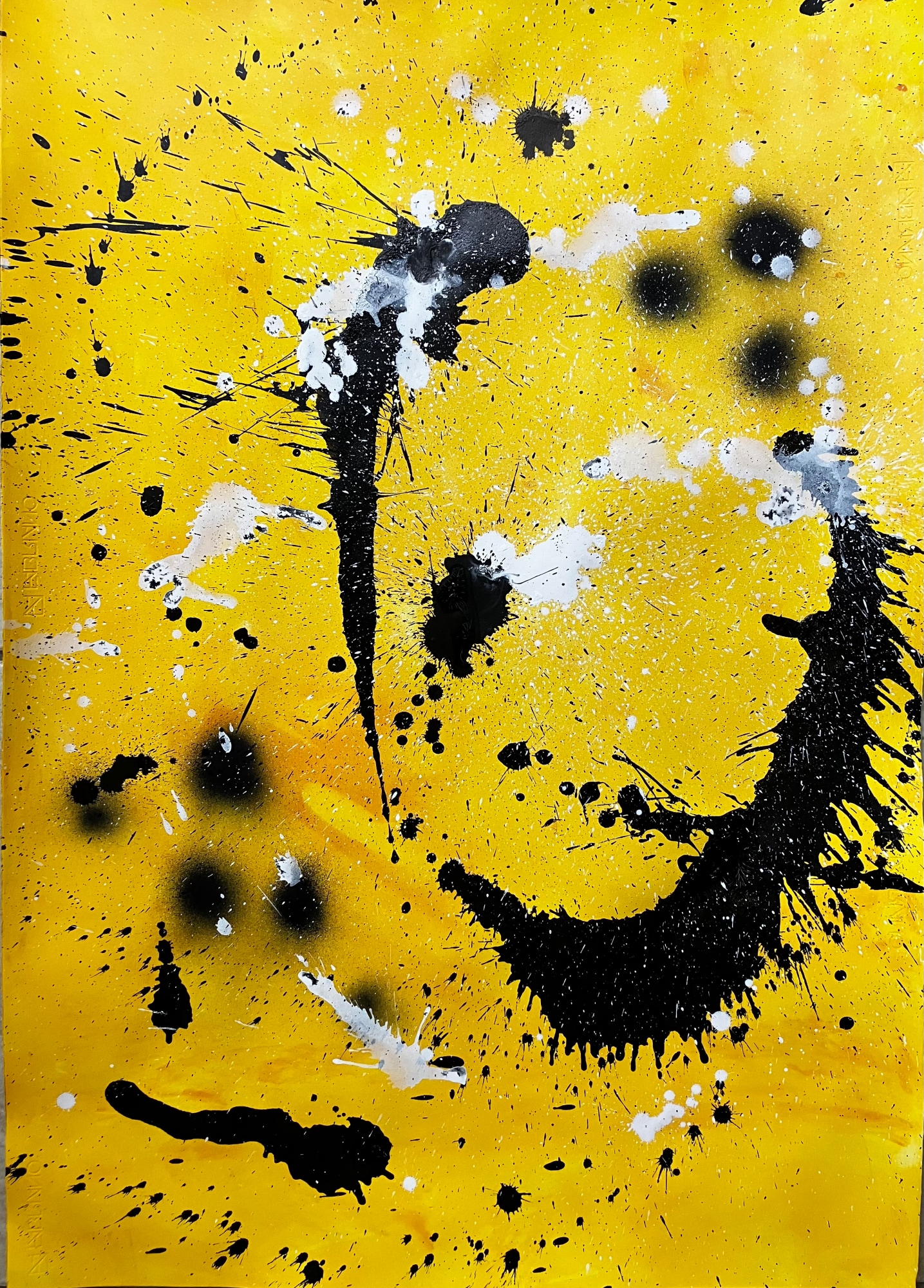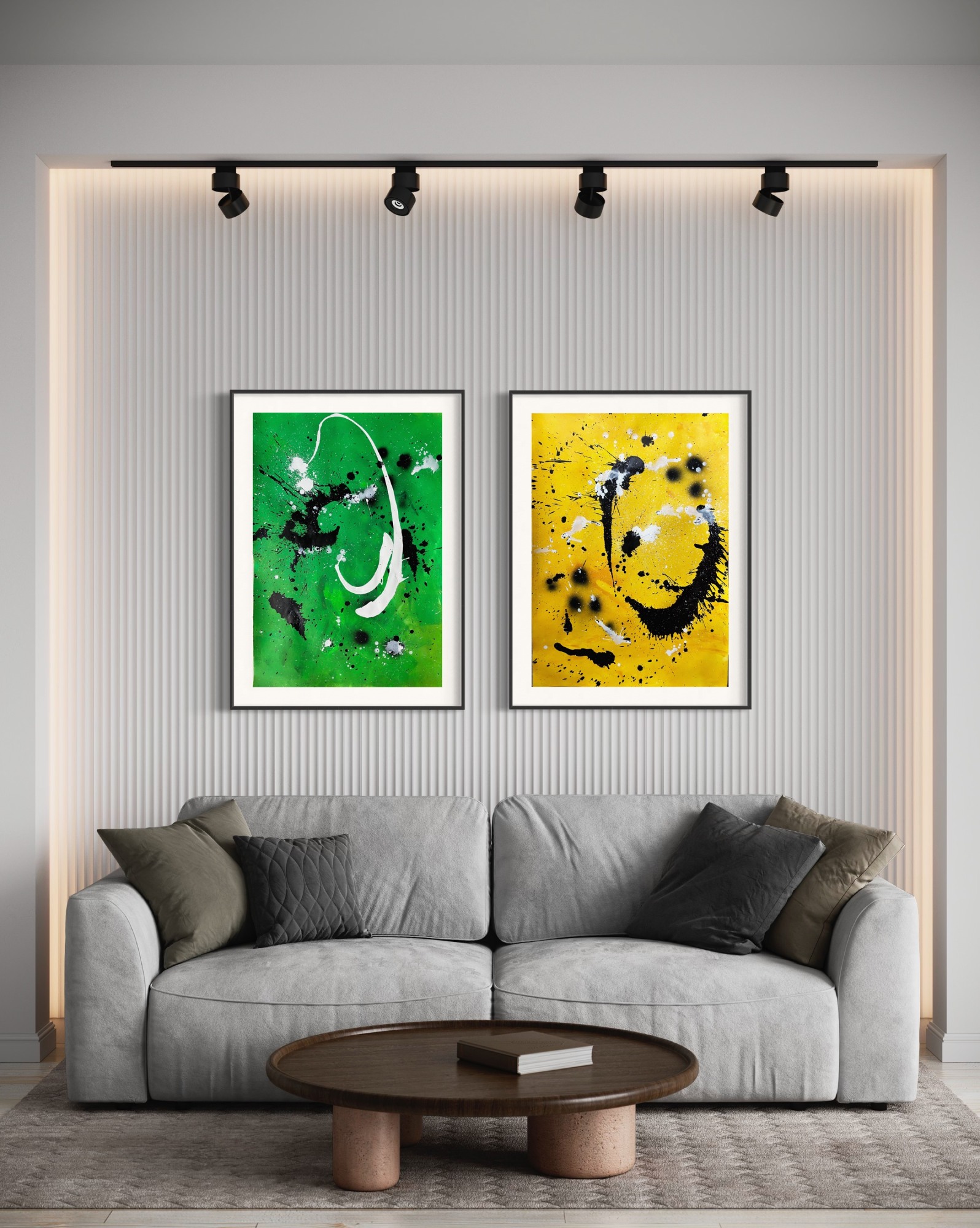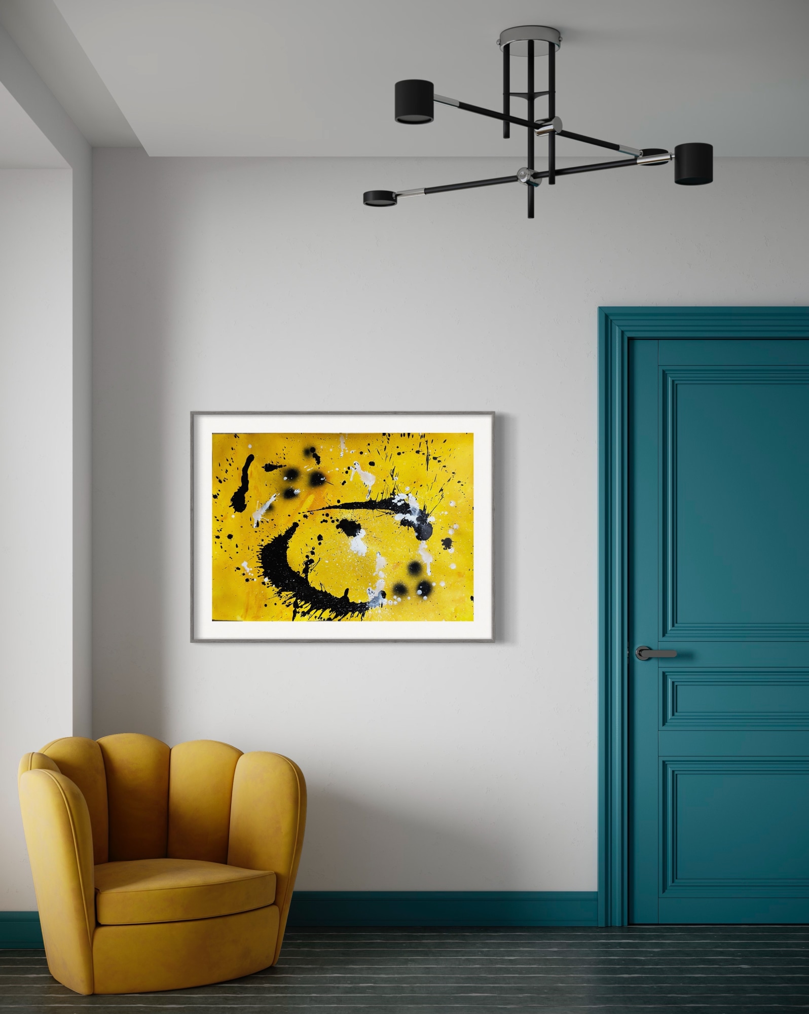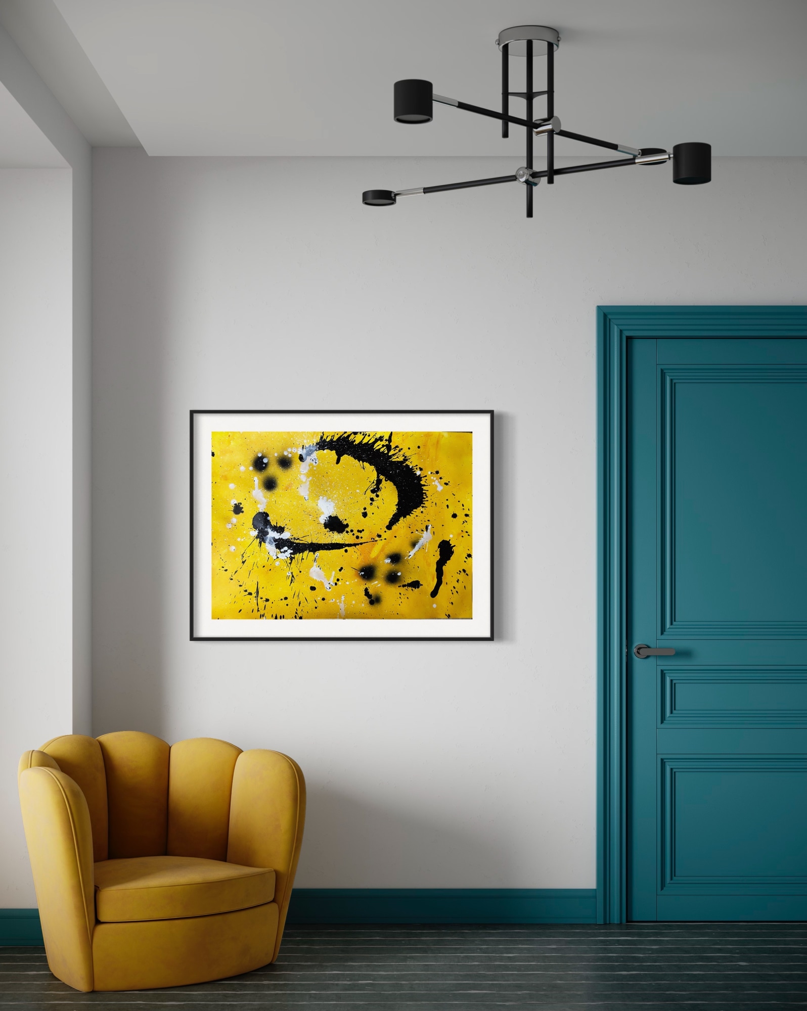 "Transformative Power (Bright Yellow)" features a vibrant yellow background with dynamic splashes of black and white, creating dancing forms. Yellow symbolizes energy and optimism, embodying the transformative process. Just as a caterpillar becomes a butterfly, transformation requires power and provides power. This painting captures the journey of questioning ourselves, reflecting on past and future choices, and stepping out of our comfort zone. The process is challenging but enriching, illuminating the path to newfound strength and vitality.