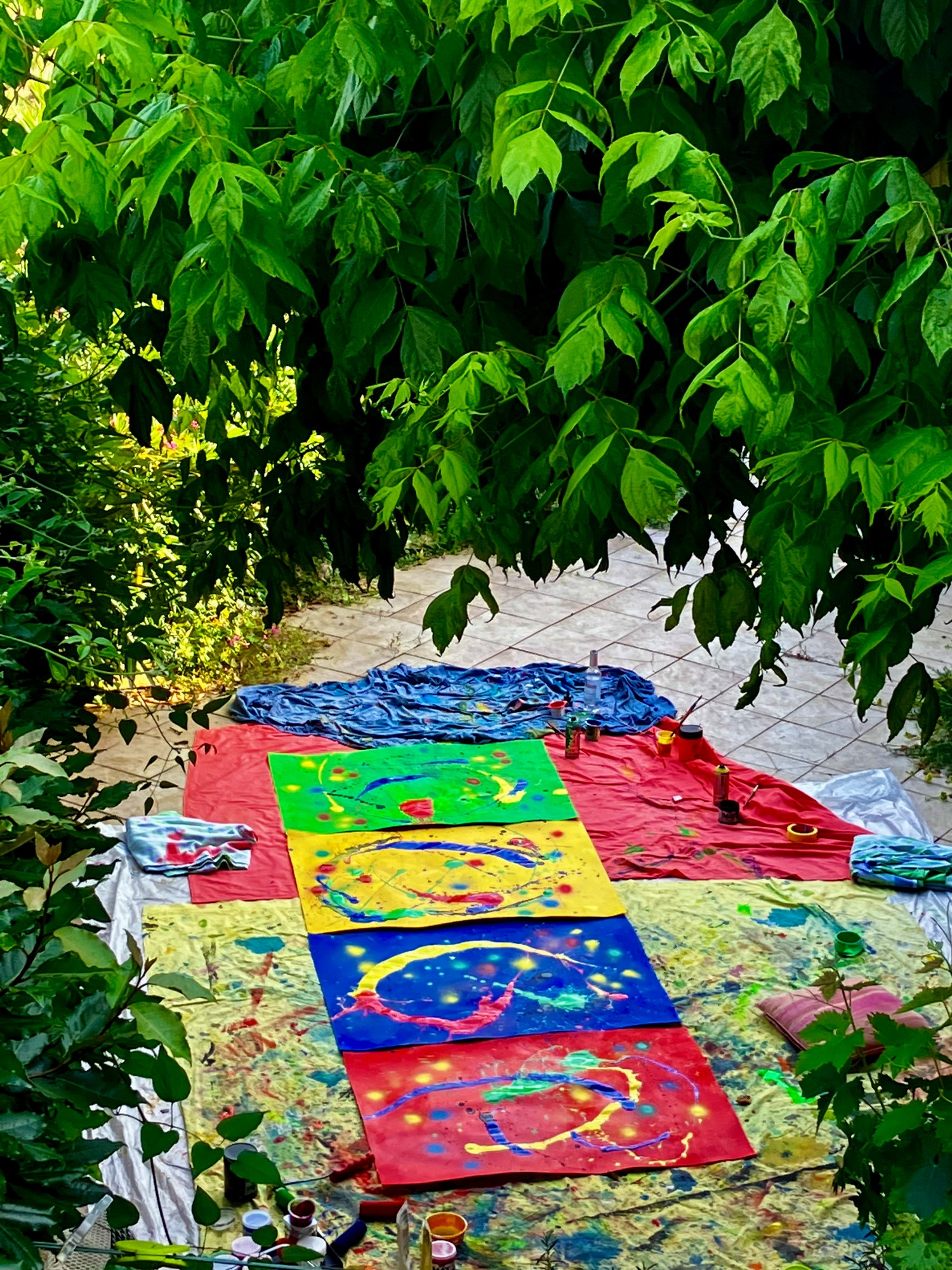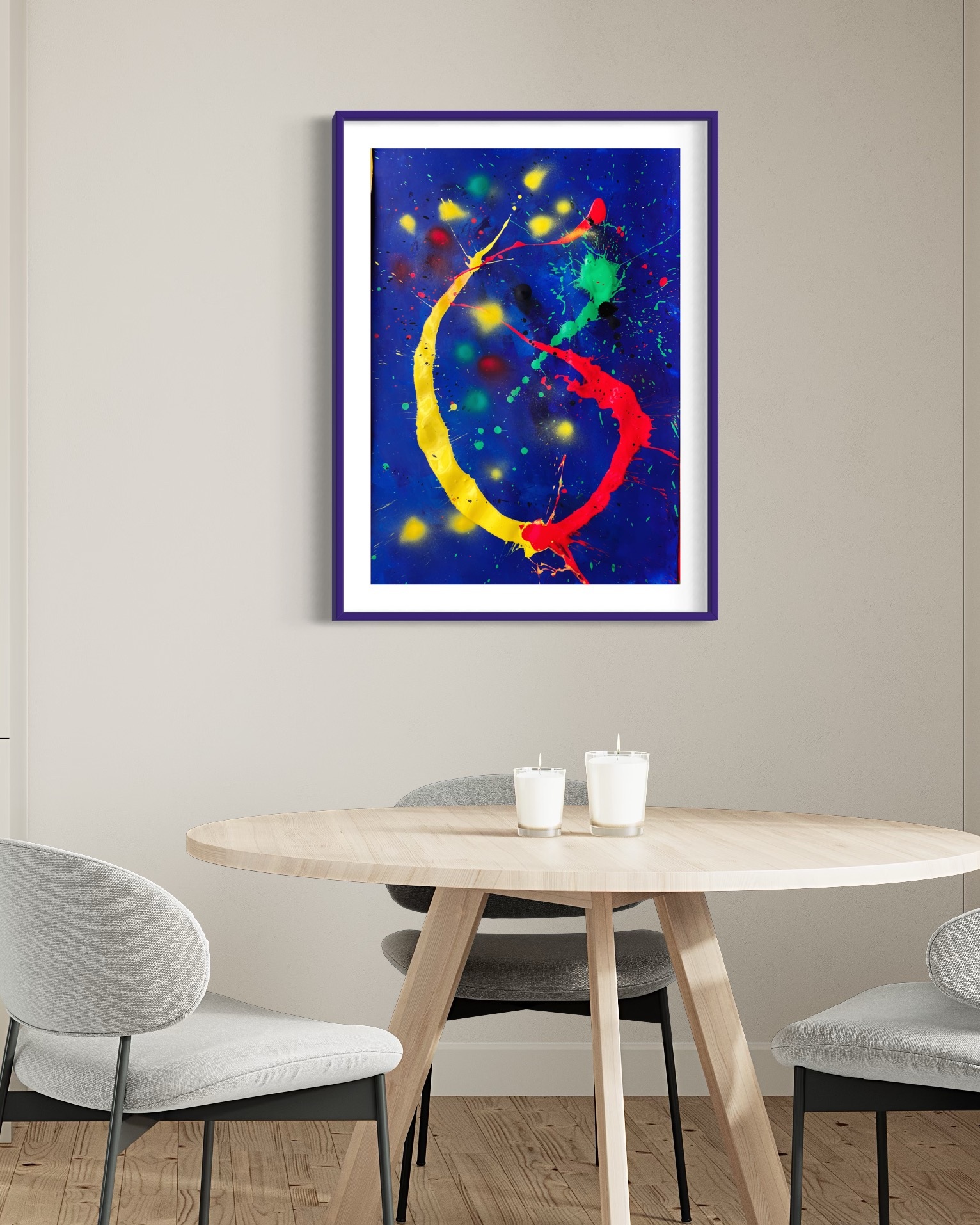 Vitality BLUE showcases a deep blue background with vibrant splashes of yellow and orange-red. This piece represents the merging of energies, symbolizing the formation of something new. The striking contrast of colors captures attention, evoking curiosity and contemplation, and leaving a lasting impression of dynamic creation.