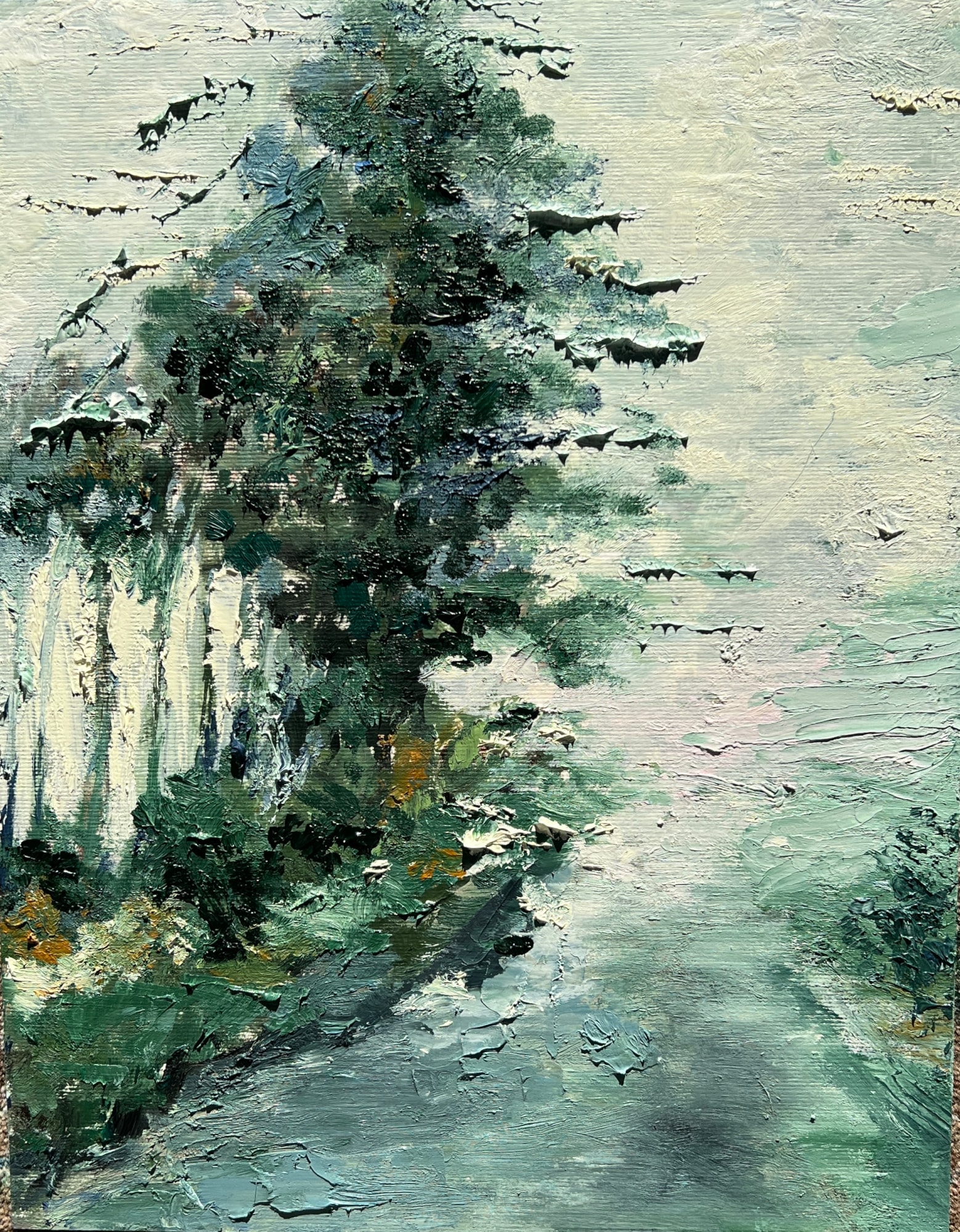 It features a loose, impressionistic style with thick brushstrokes that create a sense of movement and texture. The overall look of the painting is light and airy with a soft, hazy feel.