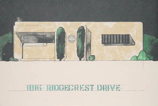 Image of a simplified house with architectural markings and guidelines. The sky is black, the trees are green and the house is a muted yellow. Underneath the image ther are lines that block out text that reads: " 1816 Ridgecrest Drive"