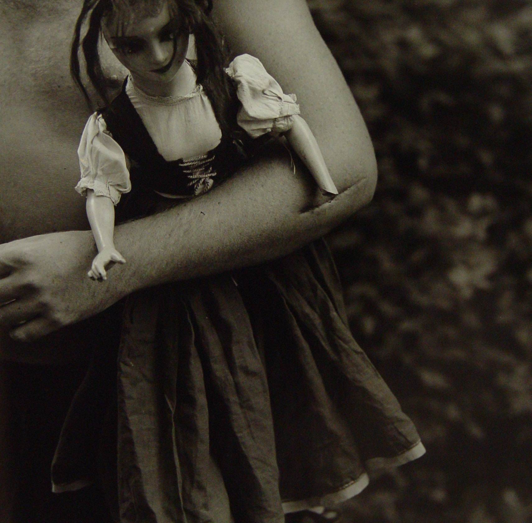 Image is close-up of a man's arm holding a tattered porcelain doll whose left hand is missing. The doll is wearing a dress that ties in the front.