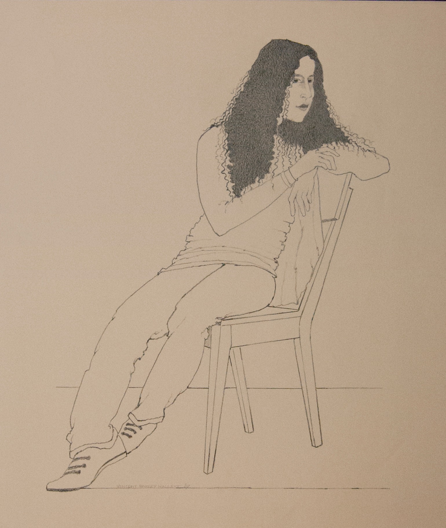 A figure drawing of a woman w/ thick, dark, curly hair sitting on a wooden chair. The woman is wearing a long sweatshirt, pants, and tennis shoes. Paper is tan in color and textured.