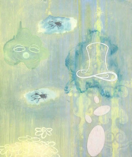 Graphic rendering of two flies, a cracked egg with shell, a top hat, daisy flowers and a pair of white overalls. All the images are floating in a neutral background of layered blues and chartreuse. Some of the images have clouds of smoke framing them. In the lower right there's a filigree like design. The painted surface was finished with wax which gives the composition an overall soft focus effect.