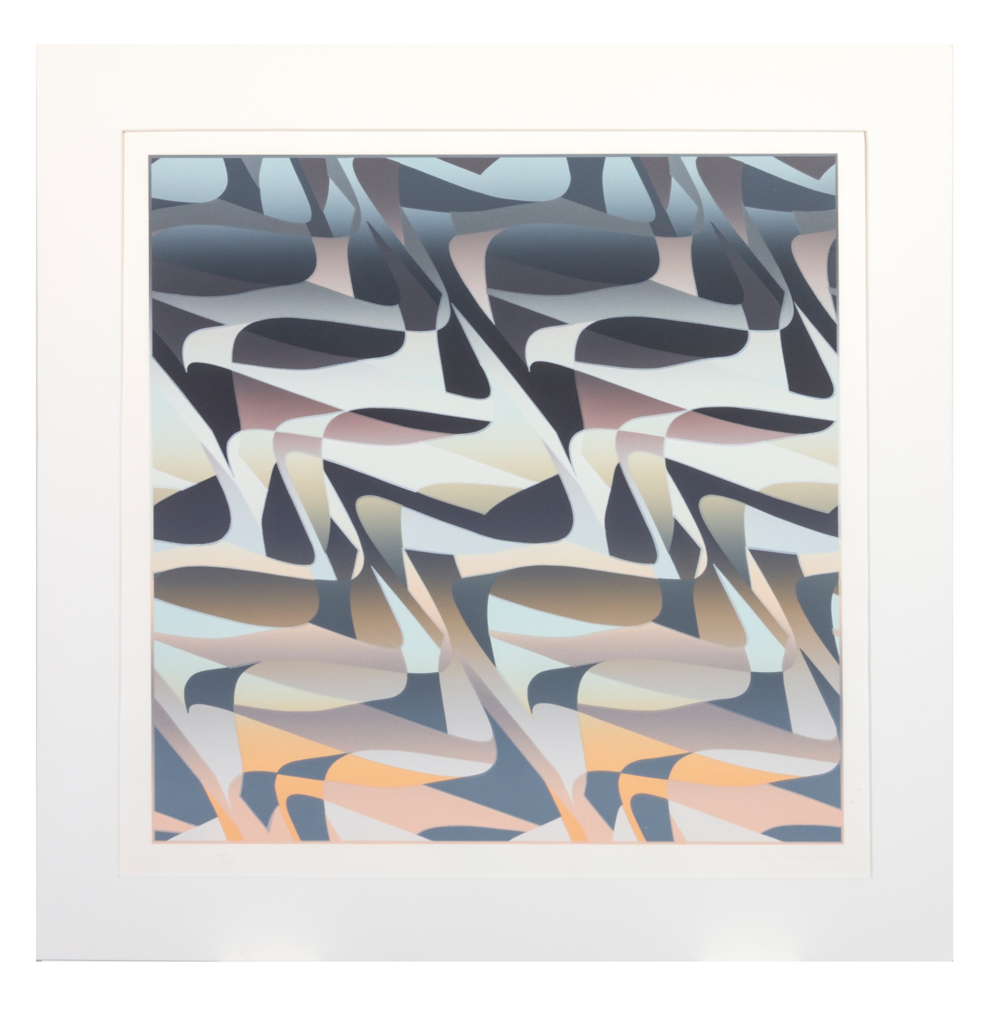 Geometric abstraction made of overlapping, curvilinear lines. The lines are orientated in a diagonal pattern. All shapes created by the overlapping are filled. Colors at the top of the composition are cool toned blues, grays, and taupes. The colors transition to greens, then pink and oranges with a dark gray and taupe shadowing.