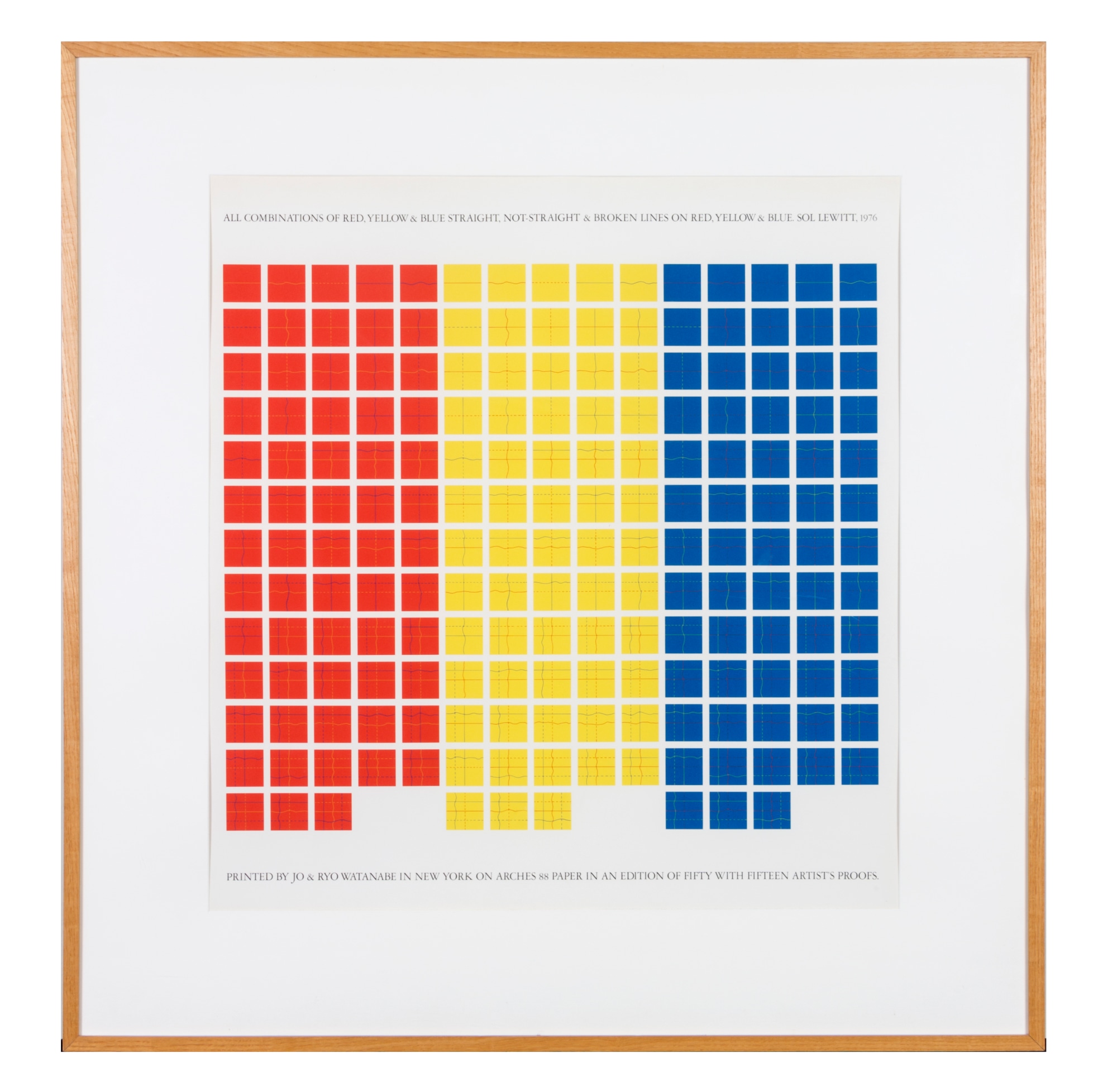 A grid comprised of 3 columns of colors: a red, yellow, and blue. There are 63 squares in each grouping and each square has a different configuration of a straight, not straight and broken lines. Also in red, yellow and blue. Black text on the top has the title of the piece w/ "Sol LeWitt 1976" and text along the bottom edge reads "Printed by Jo & Ryo Wantanabe in New York on Arches 88 paper in an Edition of Fifty with Fifteen Artist's Proofs"